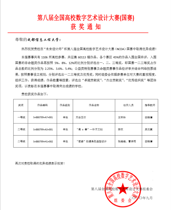 【本网讯】近日,第八届全国高校数字艺术设计大赛(NCDA大赛)国赛评审工作落下帷幕。由乐动文化艺术学院田晓膺、吴双翼老师指导的学生作品,经过西南片区赛和国赛的层层选拔,荣获国赛一等奖1项、国赛二等奖2项。这是乐动学子首次参加该项赛事并取得可喜的成绩。