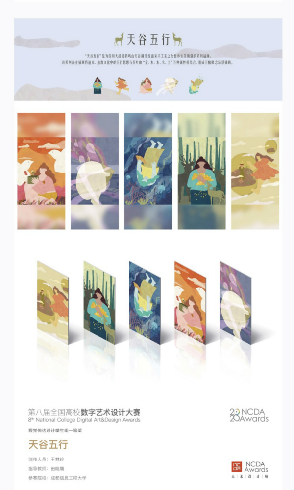 大赛共有来自全国的1106所本科和专科高校报名参赛,其中包括北京大学、浙江大学、中央美术学院、中国美术学院、四川大学、四川美术学院等国内知名高校,共征集作品60113幅,得到中共中央宣传部“学习强国”学习平台、中国教育报、人民网等权威媒体的报道。乐动文化艺术学院视觉传达设计专业2020级学生王林铃作品《天谷五行》(指导教师:田晓膺)荣获国赛一等奖,并在“学习强国”学习平台进行展示。