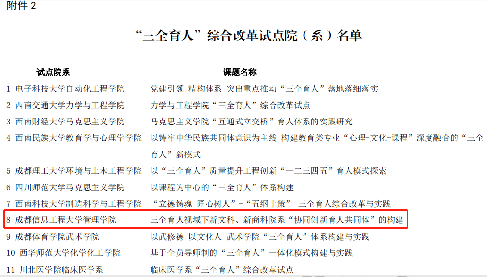 【本网讯】近日,根据《中共四川省委教育工作委员会关于公布“三全育人”综合改革试点高校和试点院(系)评选结果的通知》(川教工委函〔2020〕73 号),乐动管理学院申报的《三全育人视域下新文科、新商科院系“协同创新育人共同体”的构建》 获批“三全育人”综合改革试点院(系)立项。