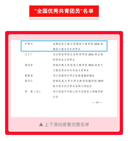 【本网讯】为表彰先进,宣传先进,激励全国团员、团干部和各级团组织奋发有为、再创佳绩,近日,根据共青团中央《关于表彰“全国优秀共青团员”“全国优秀共青团干部”“全国五四红旗团委(团支部)”的决定》,乐动通信工程学院通信工程专业2016级5班学生尹博文荣获“全国优秀共青团员”称号。