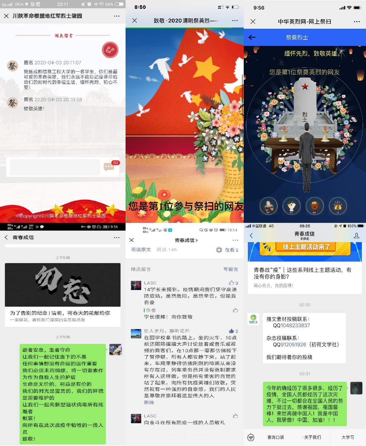 学校下半旗志哀。上午10时,汽车、火车、舰船鸣笛、防空警报鸣响,广大成信青年同全国人民一起在家默哀3分钟,表达对抗击新冠肺炎疫情斗争牺牲烈士和逝世同胞的深切哀悼。全体团员通过班团主题活动等形式,开展学习抗“疫”先进模范事迹,参与“云”祭扫,向革命烈士鞠躬献花,抒写感言寄语等线上线下系列哀悼活动,传承中华魂,弘扬伟大爱国主义精神。