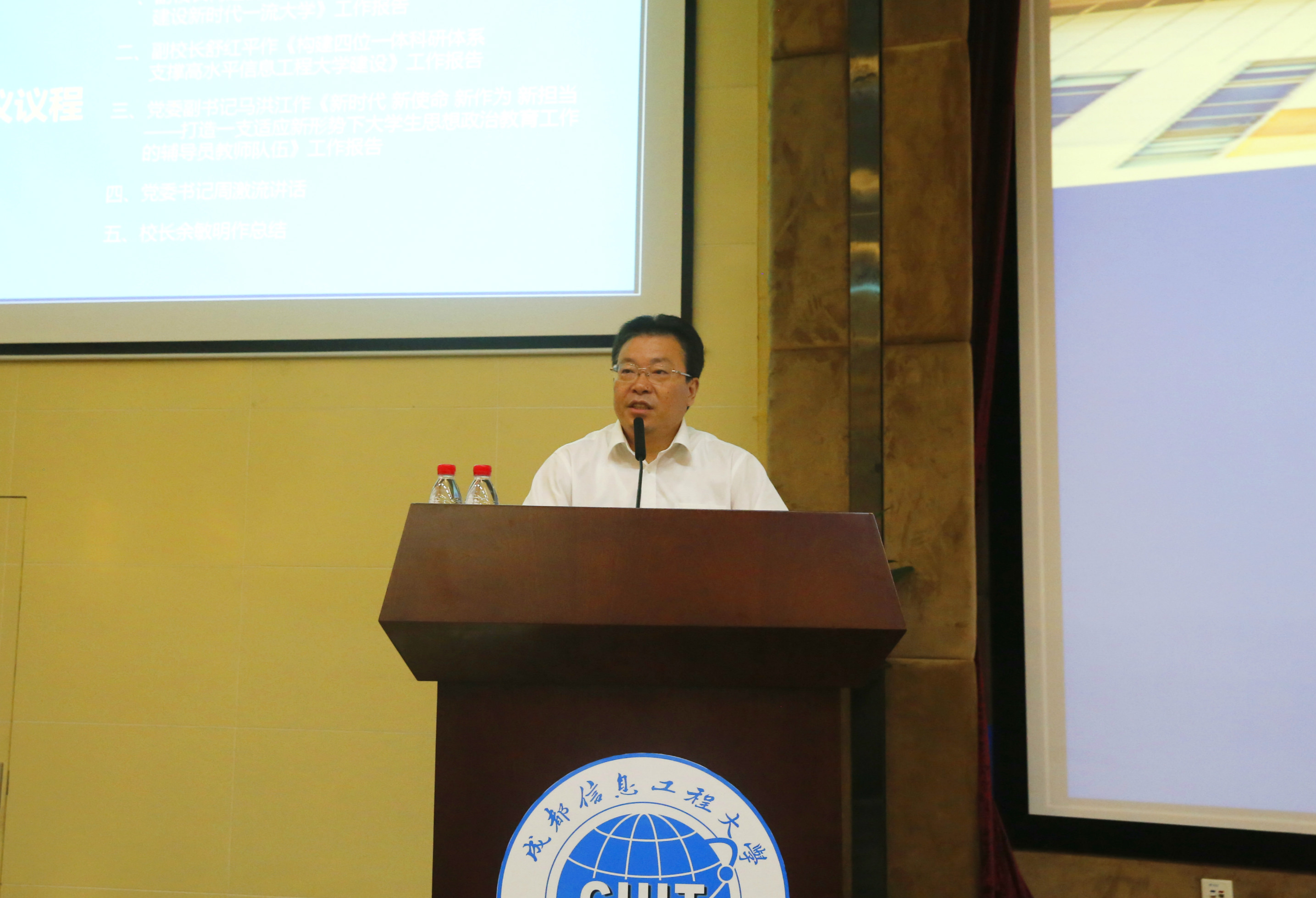 党委书记周激流强调指出,学校面临几个关键时间节点,需要广大教职工,特别是全体干部要认清形势,明确任务。一是年度时间过半,要认真总结上半年的工作,布置下半年的工作,展望未来的工作。二是处于本科“一流专业”建设和“双万”工程建设的关键节点,需要举全校之力,努力取得更好成绩。三是下学期学校将召开党代会,需要大家齐心协力把党代会的方案以及未来五年的方案制定好,以引领学校发展。四是下学期学校将开展“不忘初心、牢记使命”主题教育,贯彻习近平总书记提出的“守初心、担使命、找差距、抓落实”,要提前部署,落实到位。五是还有半年时间,国家将启动博士授予权单位申报工作,需要我们齐心协力完成各项工作。周激流对贯彻会议精神,做好今后工作提出四点要求:1.牢记初心。就是要始终围绕“建设开放的特色鲜明的高水平信息工程大学”的目标不懈奋斗;2.坚定信心。学校发展取得的成就证明,只要全体教职员工团结起来,奋发努力,我们在教育教学、科学研究、人才培养、师资队伍建设等方面是能够大有作为的。3.找准差距。即干事创业精气神不够、学术高度不够、专业特色不明显、办学经费紧张。4.苦干实干。首先要对标今年的重点工作,及时查漏补缺。其次要把“一流本科”申报工作作为这个假期的重中之重。其三要做好学院五级到十三级的聘任工作。其四要以今天几个报告及讲话为依据,做好学院发展定位以及学科建设、专业建设规划。