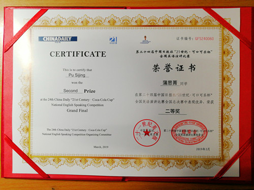 乐动外国语学院2017级蒲思菁同学以川渝赛区冠军的资格进入第24届中国日报社“21世纪•可口可乐杯”全国英语演讲比赛大学组半决赛/总决赛。在清华大学、南京大学、四川大学、西安交通大学、南开大学、吉林大学、外交学院、河南大学、厦门大学、中国石油大学、上海财经大学、东北大学、中国海洋大学、华中师范大学、北京外国语大学、上海外国语大学、天津外国语学大学等分区赛冠亚军、港澳台高校代表和上届比赛前五名选手70余人组成的高水平阵容中,蒲思菁同学凭借赛前与指导老师杨云安副教授一起的精心准备和自己临场的优秀发挥,最终获总决赛二等奖。同时,她还凭借展示自己洞察力的小视频节目获得“可口可乐中国‘在乎力’特别奖”。