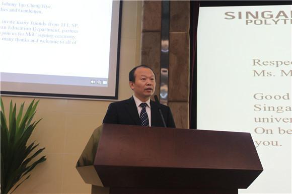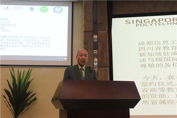 【本网讯】1月17日上午,学校与新加坡理工学院CDIO教师培训项目签约仪式在航空港校区国际会议厅举行。新加坡理工学院董事会副主席Johnny Tan Cheng Hye、淡马锡国际基金会执行总裁Benedict Cheong、新加坡驻成都总领事馆政务领事Melissa Tan、省教育厅国际交流服务中心副主任王拉沙、学校副校长何建新等参加签约仪式。签约仪式由学校国际交流与合作处副处长刘伟主持。