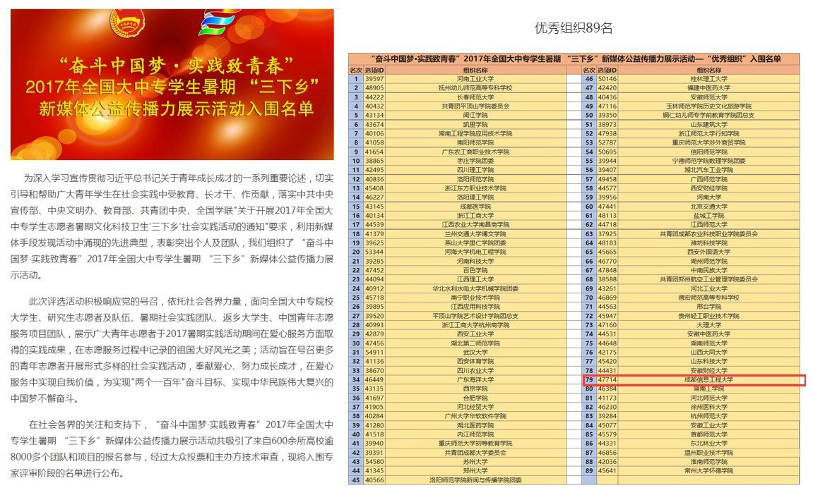 与此同时,乐动社会实践还在其他各类评选活动中也有突出表现。其中,在2017年全国大中专学生暑期“三下乡”新媒体公益传播力展示活动中,学校获得“优秀组织单位”称号,两支“湿地使者行动”团队获得“‘最美发现中国’团队”称号,校团委陈敏老师获得“优秀指导教师”称号。在全国暑期“三下乡”社会实践“千校千项”成果遴选活动中,学校“青春建新功·恒心成未来”关爱留守儿童暑期社会实践项目荣获“最具影响好项目”称号。