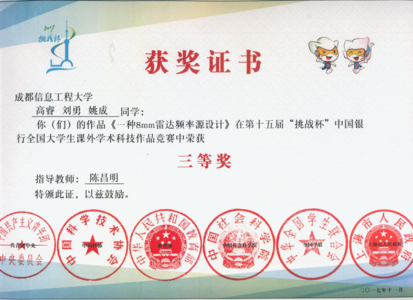 【本网讯】11月14日至19日,由共青团中央、中国科协、教育部、中国社会科学院、全国学联和上海市政府主办,上海大学承办的第十五届“挑战杯”全国大学生课外学术科技作品竞赛终审决赛在上海大学宝山校区举行。乐动由通信工程学院陈昌明教授指导,高睿团队的作品《一种8mm雷达频率源设计》项目获得全国三等奖。