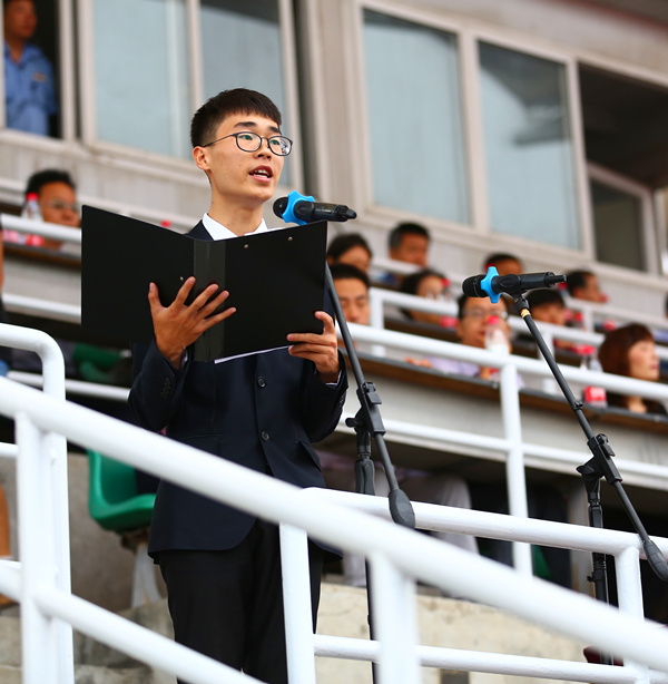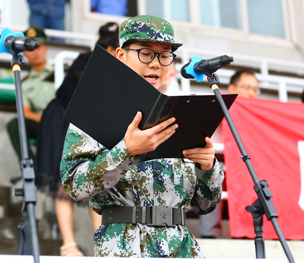 2017级电子工程学院本科新生代表李敬远在军训动员大会上发言。他说,从今天开始,同学们就将以军人的标准严格要求自己,听从指挥,服从命令,严格遵守军训纪律和作息时间。要珍惜这次军训的宝贵经历,把在军训期间养成的良好习惯、作风带到以后的学习中去,高标准,严要求的规范自己的言行,遵守学校的各项规章制度,踏踏实实地学习,刻苦锻炼,遵纪守信,自强不息,力争在新的起跑线上永争第一,做新时代的高素质大学生。