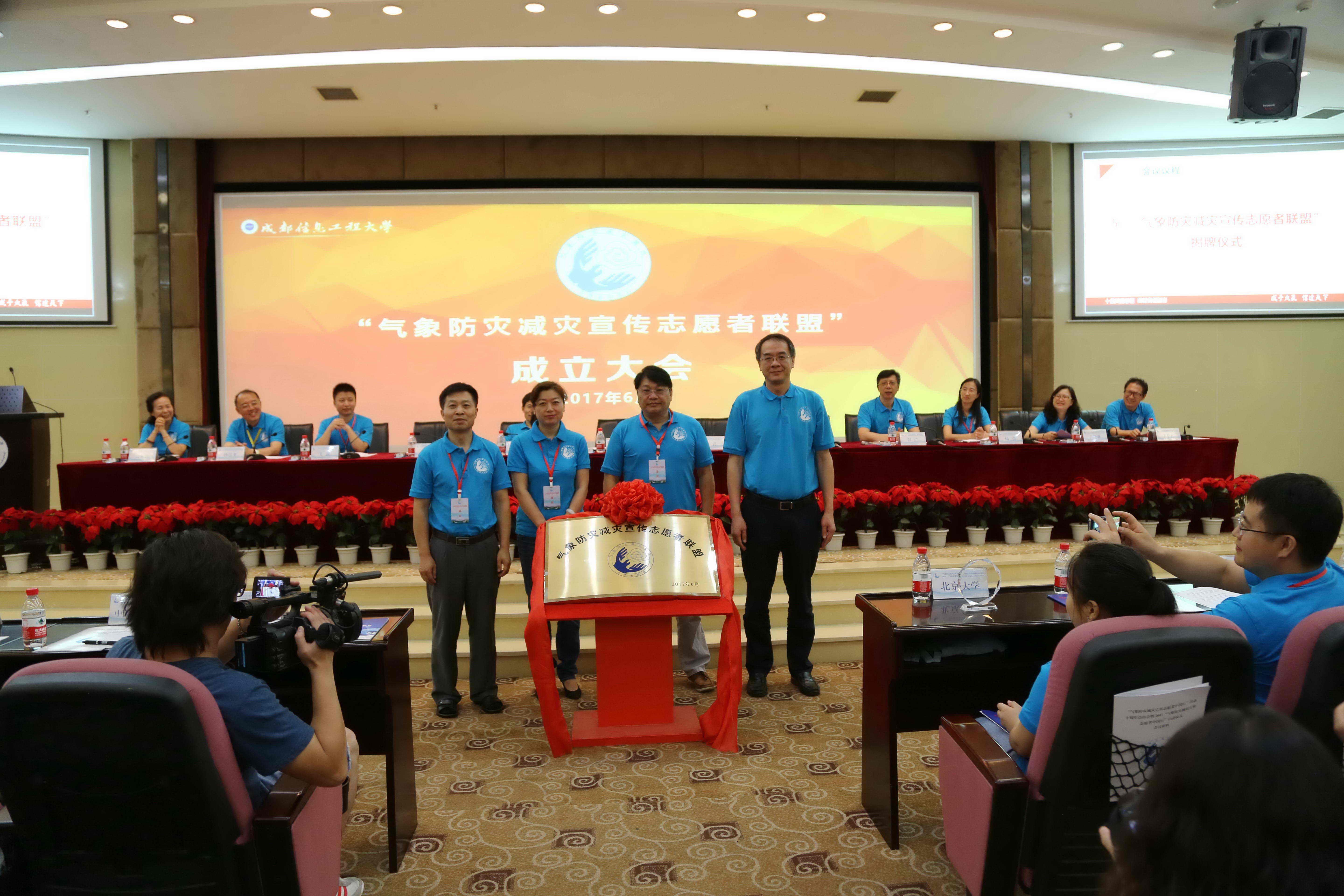 中国气象局办公室副主任洪兰江、中国科协科普部副部长钱岩、联盟理事长翟盘茂、乐动在线登录校长余敏明为“气象防灾减灾宣传志愿者联盟”揭牌。