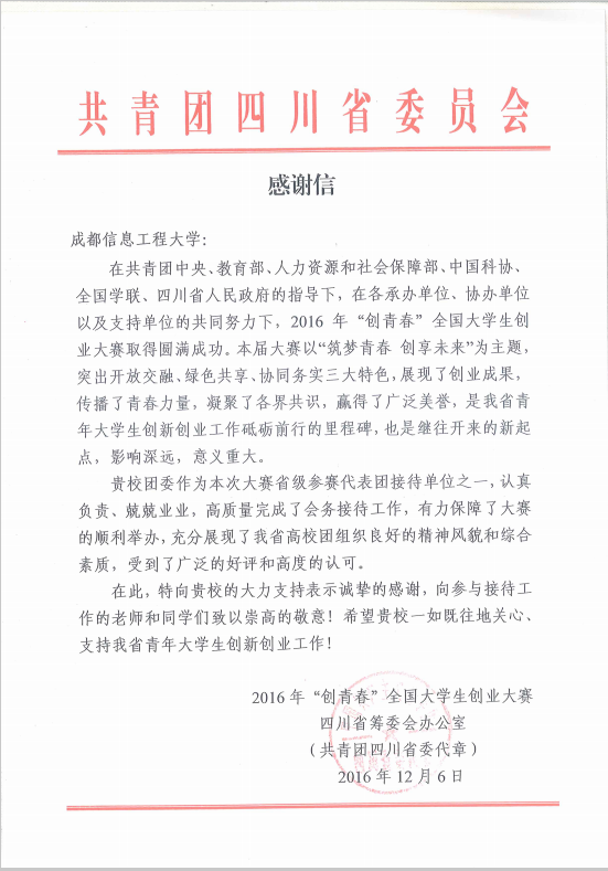 【本网讯】日前,共青团四川省委给乐动发来感谢信,感谢乐动为2016年“创青春”全国大学生创业大赛的成功举办所提供的巨大帮助和支持,并对乐动在省级参赛代表团接待工作中的突出表现给予了高度评价。