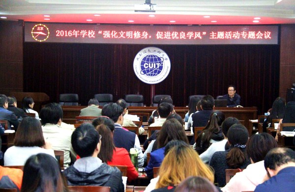【本网讯】10月13日下午,学校在行政楼第一会议室召开“强化文明修身,促进优良学风”主题活动专题会议。副校长于世祥、何建新,学生工作处、招生就业处、校团委全体人员,各学院党总支书记、副书记,全体辅导员参加了会议。会议由学生工作处处长戴丽红主持。