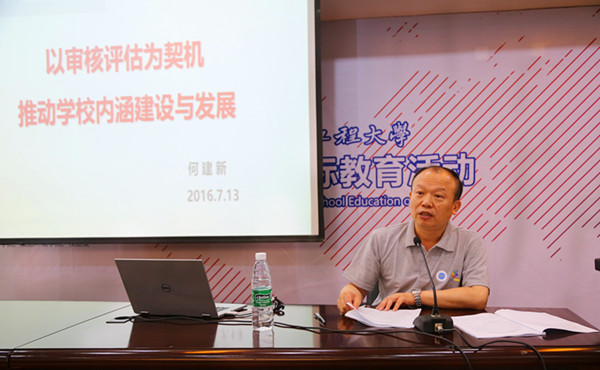 副校长何建新作了“以审核评估为契机,推动学校内涵建设与发展”的工作报告,回顾了审核评估工作开展以来乐动取得的六个方面阶段性成效:一是厘清了人才培养中存在问题,明确了本科教学建设方向;二是强化了人才培养中心地位,确立本科教学优先地位;三是多措并举,加速师资队伍建设;四是规范教学管理,加强教学基本建设;五是加强学风建设,提升学生服务水平;六是完善教学质量保障体系,加强教学质量监控。何建新提出了教学工作中丞待解决的问题,并强调应从增强全员服务教学意识,强化人才培养中心地位;加强教风、师德师风建设,提升教师综合素质;完善自我评估制度,健全质量保障体系;加强国际合作与交流,提升教师国际化水平;调整工作状态,认真完成本科教学工作审核评估工作等方面全面推动学校内涵建设与发展。