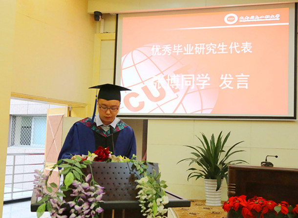 张博同学代表全体毕业研究生向母校、导师、亲人、同窗和全体教职员工致以诚挚的谢意和最衷心的感谢。回首三年学习时光,母校开阔的眼界记录了同学们青春无悔的笑脸;母校宽广的胸怀留下我们温暖幸福的瞬间;母校宽厚的肩膀承载了同学们理想与希望。他表示,作为成信毕业生,应谨记校训牢记校风,以成信人应有的胸怀和情操感恩父母,感恩学校,感恩社会。并衷心祝愿母校蓬勃发展、再书华章!