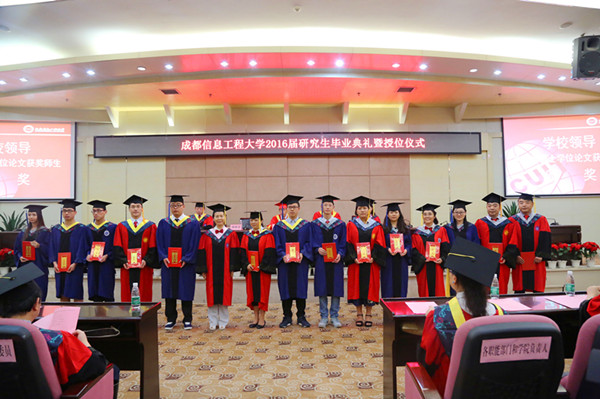 党委书记赖廷谦宣读了《四川省教育厅关于公布2016届四川省优秀大学毕业生评选结果的通知》,并为获奖学生颁奖。乐动于杰、张明、黄刚等三位同学被评选为2016届四川省优秀大学毕业生。校学位评定委员会主席、校长周激流宣读了2016届研究生授予硕士学位的决定,授予张翔等345名研究生硕士学位。学校领导周激流、敬枫蓉、贺盛瑜为26位校级优秀硕士学位论文获奖者一一颁奖。