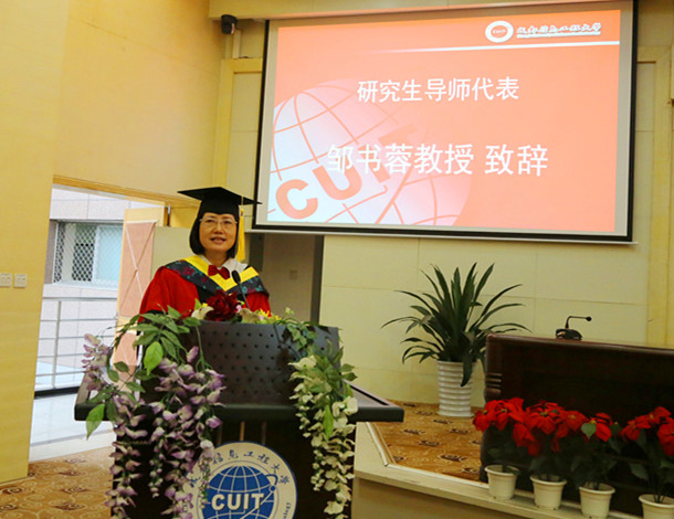 邹书蓉教授代表全体毕业生导师祝贺2016届毕业研究生取得硕士学位。她叮嘱毕业生们在今后的道路上“踏实做事、持之以恒、学会取舍”做一个有坚定信仰和远大理想的人。她希望同学们离开学校后能从现在做起、从小事做起、不怨天尤人;长期坚持,全心投入,不要轻易放弃;懂得取舍,有所不为,坚持自己的理想。毕业生们将从母校带走校训校风、带走批判精神、带走独立思考的精神,在社会的各个行业播种成信大的文化和价值。
