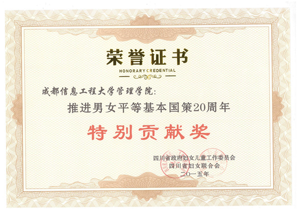 【本网讯】日前,四川省政府妇女儿童工作委员会、四川省妇女联合会联合发文,授予四川省人大内务司法委员会等291个单位、王飙等109名同志“推进男女平等基本国策二十周年特别贡献奖”荣誉称号,乐动管理学院作为省级部门先进单位代表之一,获得“推进男女平等基本国策二十周年特别贡献奖”荣誉称号。