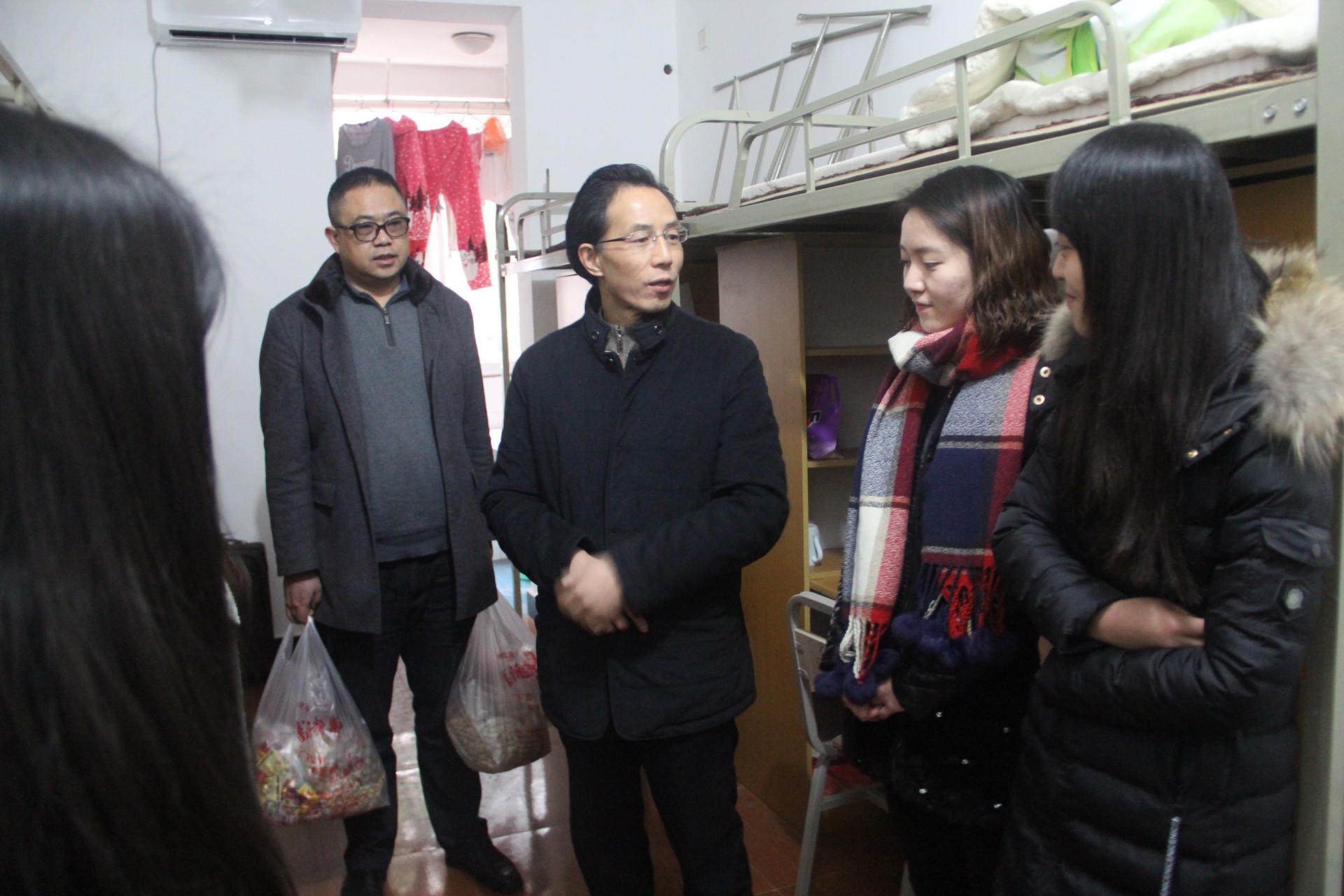 在学生宿舍,赖廷谦、周激流与留校同学们亲切交谈,详细询问了学生们的家庭情况、学习和生活方面存在的困难。赖廷谦、周激流叮嘱同学们,虽然远离家乡、远离父母,暂时不能团聚言欢,一定要记得给父母报平安,并通过同学们向家长表达学校的感谢和祝福;希望同学们充分利用寒假时间,劳逸结合,做一些有益的事情,过一个愉快而充实的春节;要求同学们严格遵守学校留校管理制度,牢固树立安全意识,注意防火、防盗与交通安全,确保大家过一个平安的寒假;勉励同学们克服困难,努力学习,心怀家国,时刻不忘当代大学生所肩负的责任,履行当代大学生的使命。赖廷谦、周激流表示,学校一直坚持以学生为本,全力为同学们做好教育、管理和服务工作,学校将永远是同学们的家。