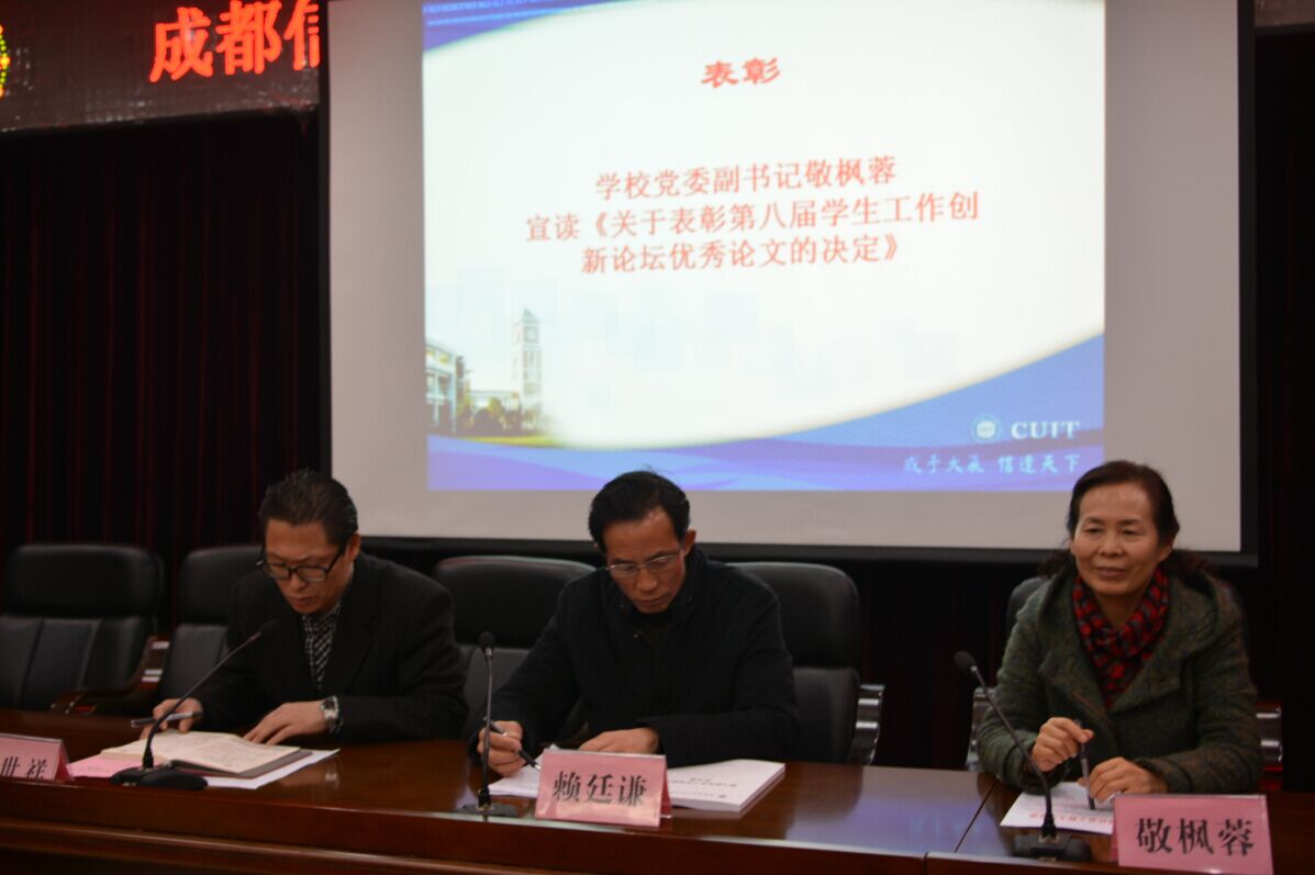敬枫蓉宣读了《乐动在线登录关于表彰第八届学生工作创新论坛优秀论文的决定》。乐动2015年第八届学生工作创新论坛共收到36篇论文,论文主题广泛、涉及面广,密切关注学生工作中的新现象、新情况,并提出了新的解决方案。大会对刘全等撰写的《基于大数据的我国人才市场对高校毕业生素质能力需求的分析》等11篇获奖论文给予了表彰。