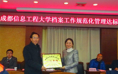 【本网讯】12月29日,由省档案局经济科技档案业务指导处处长林红为组长,省档案局经济科技档案业务指导处副处长王晓瑜、四川大学档案馆馆长党跃武、电子科技大学档案馆馆长饶永,省档案局经济科技档案业务指导处副主任科员刘荔枝组成的四川省档案工作规范化管理定级考评专家组莅临乐动,对乐动档案工作规范化管理省一级标准资格进行了考评认定。经过专家组评审,乐动档案工作规范化管理达到四川省一级标准。专家组组长林红为乐动颁发证书并授牌,学校党委书记赖廷谦代表学校接受证书和牌匾。