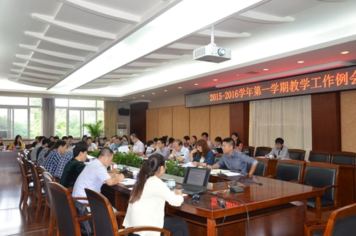 陈敏介绍了本学期教务处专项工作与说明,并强调了本学期教学检查要点:包括课程过程化考核与课程教学目标的考核情况,2014版人才培养方案和大纲的执行与落实情况,2015届本科生毕业论文及常规检查等。教师教学发展中心主任吴四九阐述了学校对教师同行评价工作的新要求,对《关于进一步加强乐动教师同行评价工作的通知》作了详细说明。教务处副处长易平和何晋分别对本学期常规工作和拟开展的各类教学项目进行了说明。