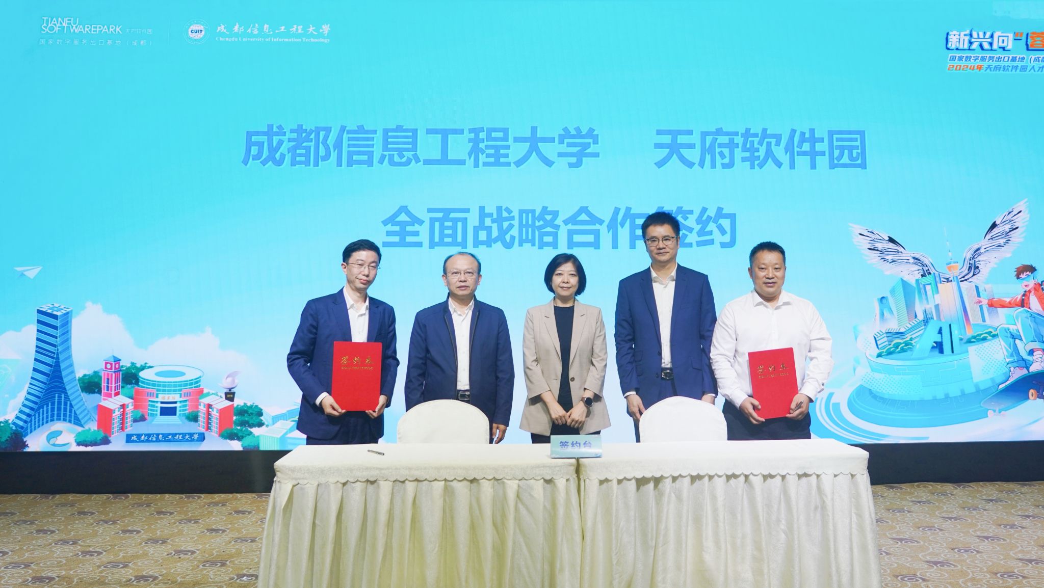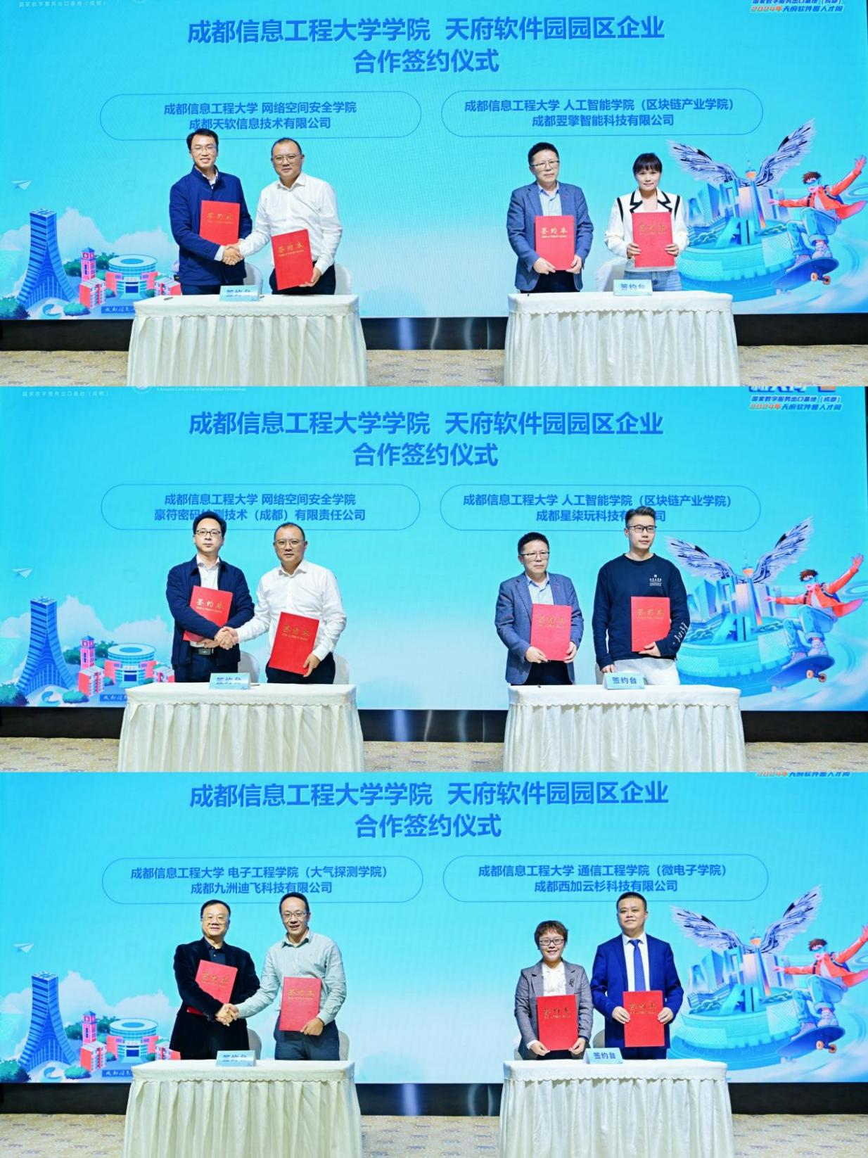 在院企签约环节,学校网络空间安全学院、人工智能学院(区块链产业学院)、电子工程学院(大气探测学院)、通信工程学院(微电子学院)分别与成都天软信息技术有限公司、豪符密码检测技术(成都)有限责任公司、成都星柒玩科技有限公司、成都翌擎智能科技有限公司、成都九洲迪飞科技有限公司、成都西加云杉科技有限公司等园区企业签订战略合作协议。