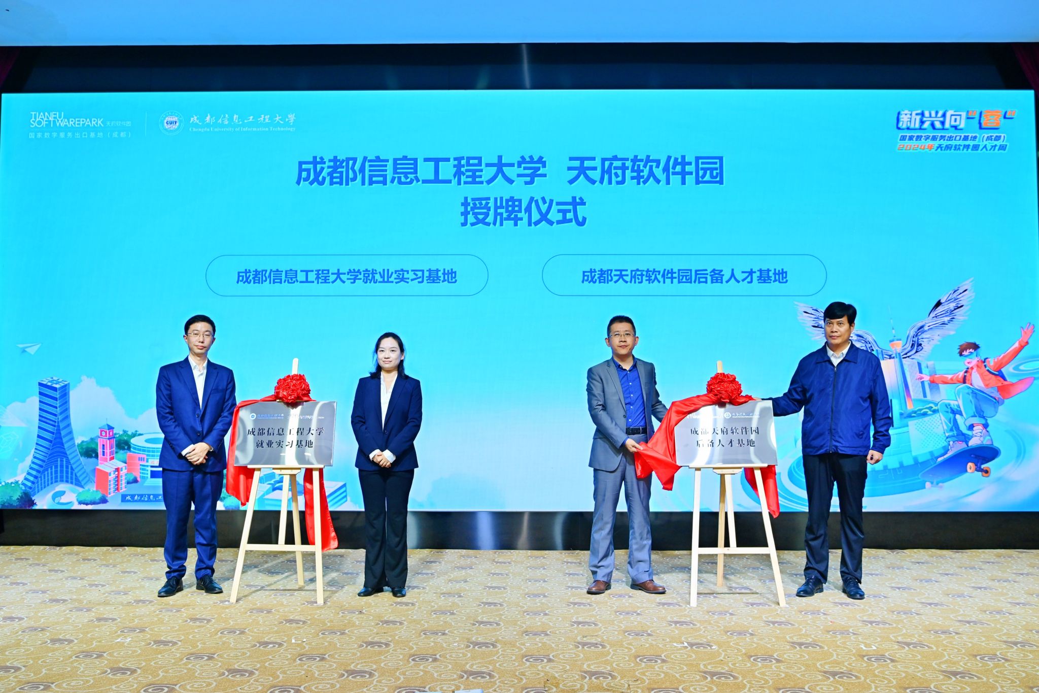 在授牌仪式上,学校招生就业处、科技处负责同志与天府软件园负责人共同为“乐动在线登录就业实习基地”和“成都天府软件园后备人才基地”揭牌。
