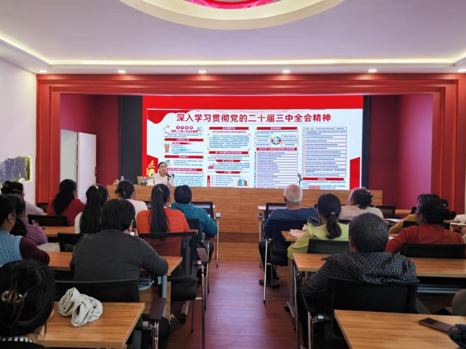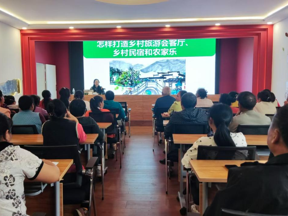 调研组一行在杵坭村村委会参加了乐动黄萍教授、曾利副教授讲授的乡村文化旅游专业技能培训课。两位老师向村民代表讲解了党的二十届三中全会精神解读、乡村旅游发展规划与前景、农家乐与民宿的发展设计等内容。