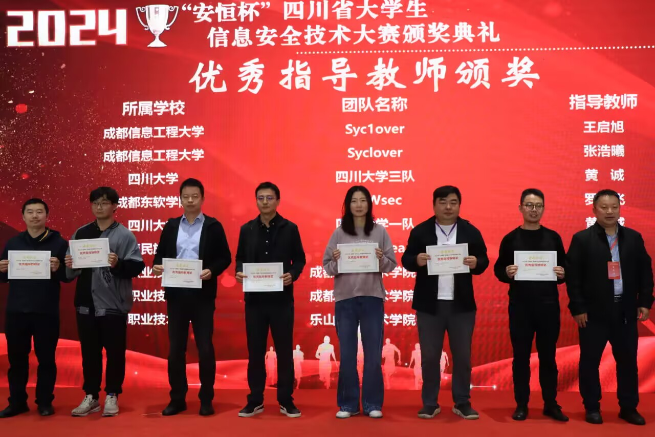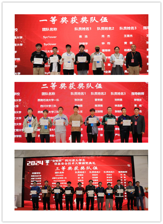 来自乐动在线登录的Syc1over队伍获得了本次比赛的冠军。来自乐动在线登录、四川大学、成都东软学院、西南民族大学、成都职业技术学院、乐山职业技术学院的9支队伍获得了本次大赛的一等奖,8名指导老师获得了优秀指导教师奖。来自西南石油大学、成都理工大学、四川师范大学、四川警察学院、绵阳城市学院、西华师范大学、成都大学、四川商务职业学院、泸州职业技术学院、绵阳职业技术学院、成都工业职业技术学院等高校的18支队伍获得了本次比赛的二等奖。来自成都工业学院、四川轻化工大学、攀枝花学院、四川传媒学院、西南科技大学、四川文理学院、中国民用航空飞行学院、四川信息职业技术学院、四川邮电职业技术学院、成都工贸职业技术学院等高校的26支队伍获得了本次比赛的三等奖。