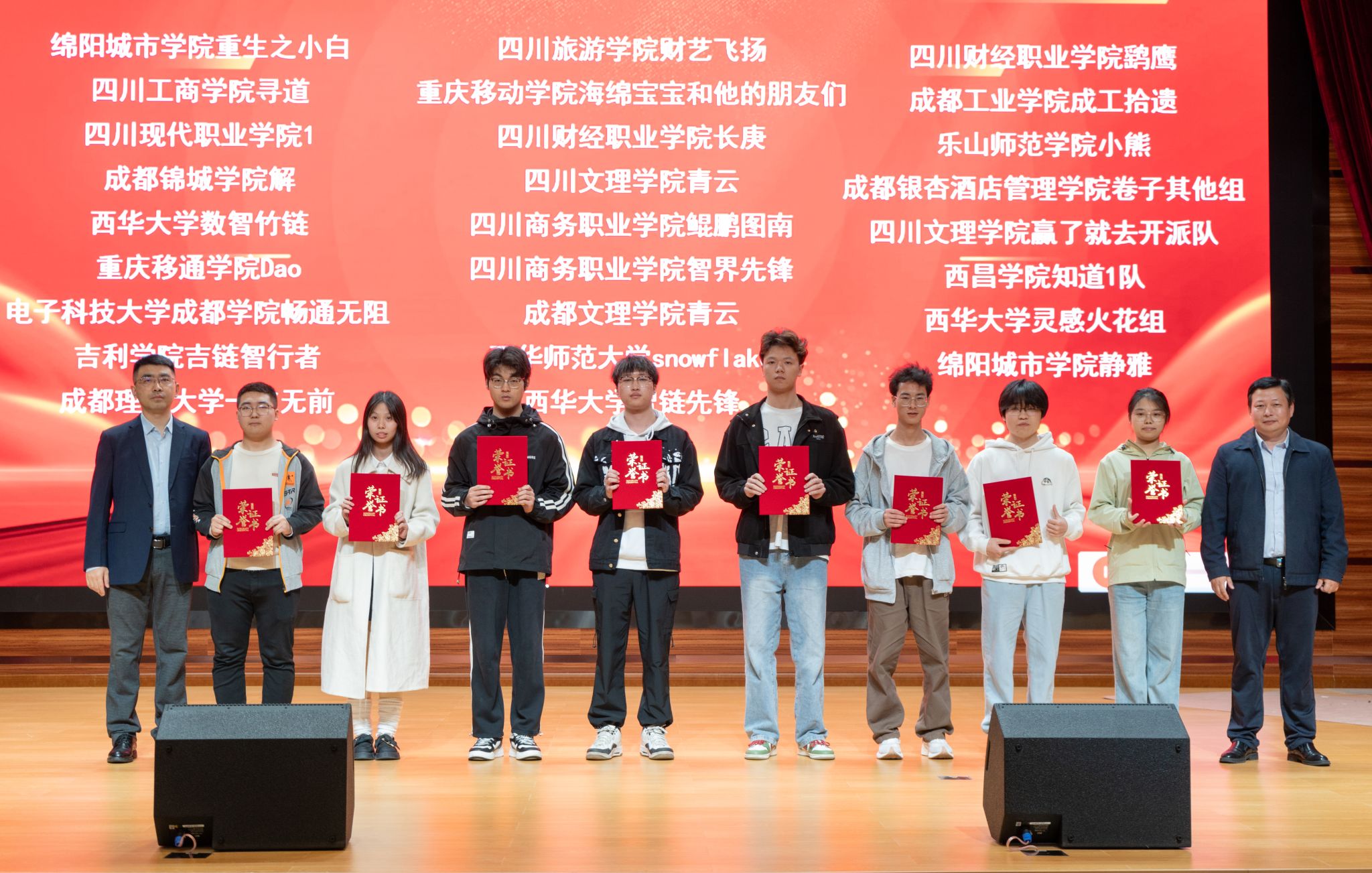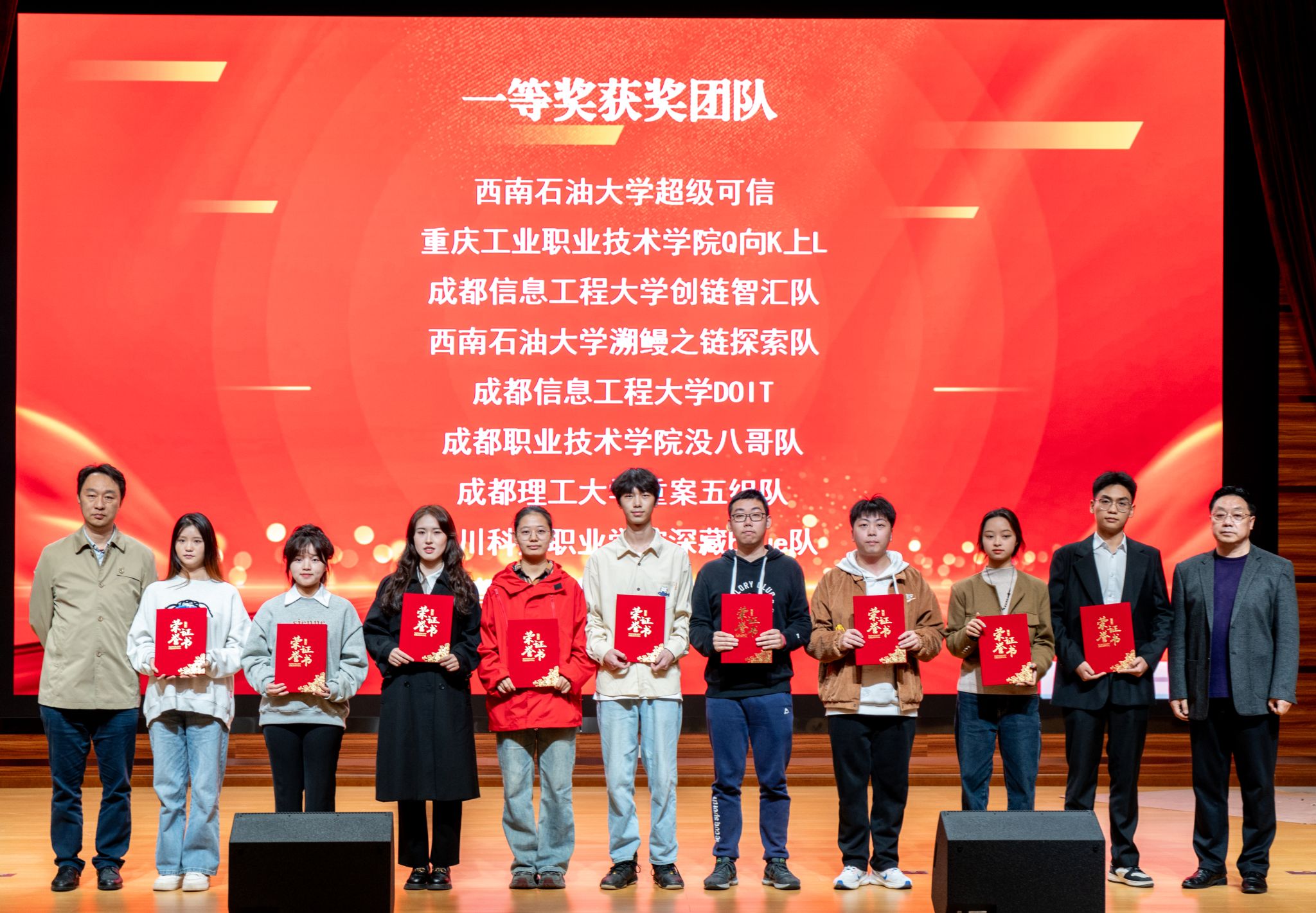10月26日下午,大赛颁奖典礼在学校成信礼堂举行。学校副校长舒红平、CCF区块链专委荣誉主任斯雪明、成都市经信局市新经济委人工智能产业处副处长蒋炆伶、CCF区块链专委秘书长孙毅、CCF区块链专委常务委员范永开、CCF区块链专委常务委员黄步添、新道科技股份有限公司西南区副总经理瞿刚以及学校相关部门领导、部分企业代表出席本次颁奖典礼。