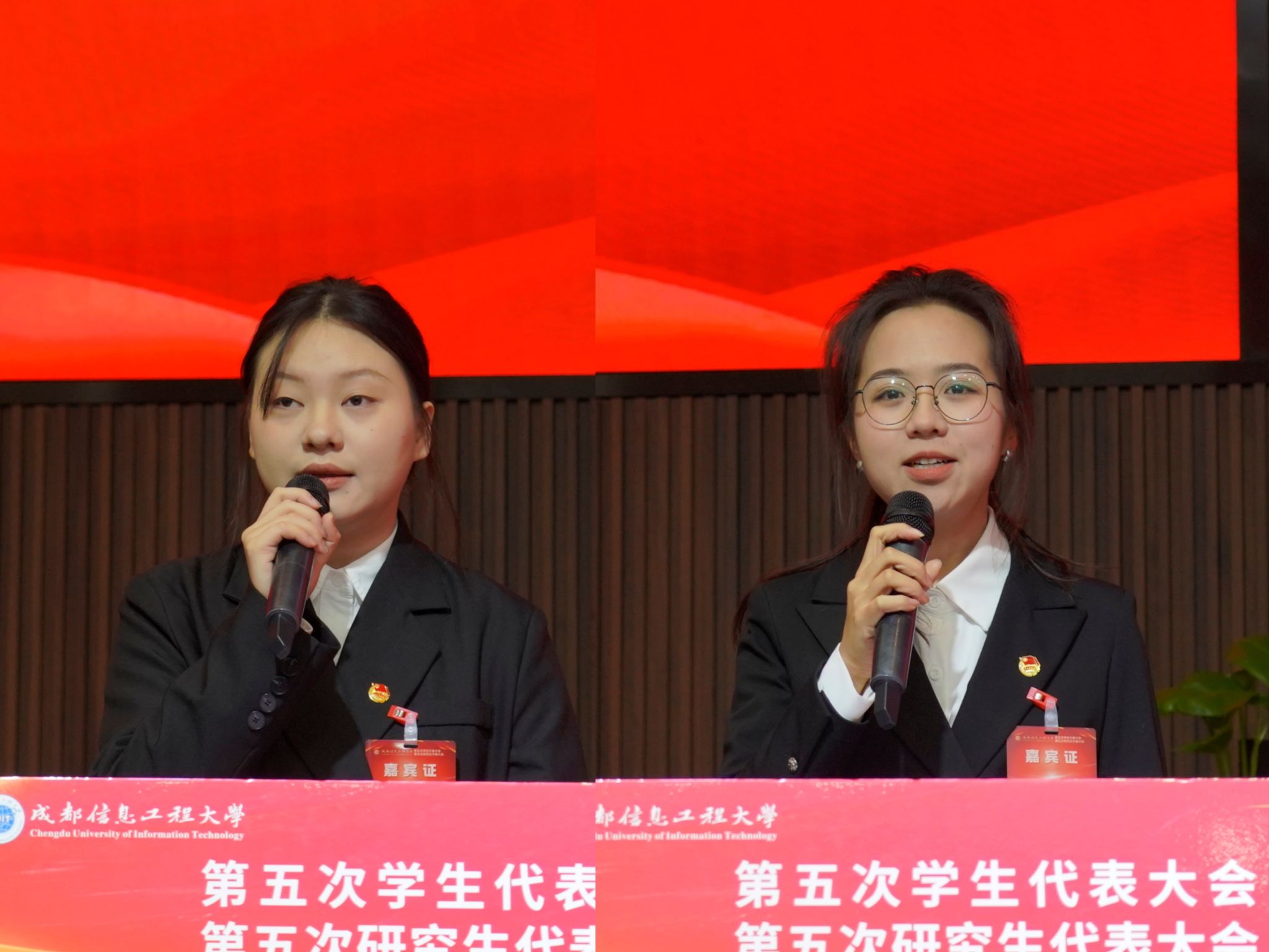 开幕会后,举行了学校第五次学生代表大会、第五次研究生代表大会全体会议。会议听取了《学生会(研究生会)工作报告》《学生会(研究生会)提案工作报告》,表决通过了工作报告决议、提案工作报告决议,完成了第五届学生委员会委员和主席团成员、第五届研究生会委员会委员和主席团成员的选举工作。选举产生了邓咏琳、廖俊为第五届学生会主席团成员,曹欣悦、高沁怡、胡可、杨利平、张洛为第五届研究生会主席团成员;校团委副书记尹欣为第五届学生会秘书长,校团委副书记王燕为研究生会秘书长。