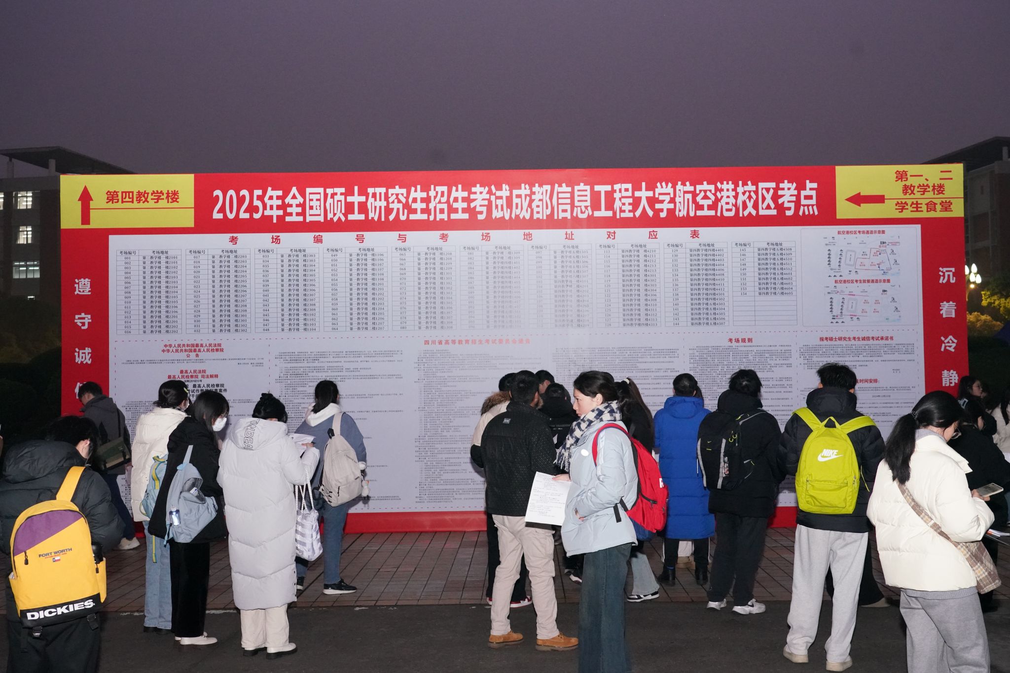 本次研考,学校考点彰显人文关怀,全心服务考生。学校各食堂正常营业并对校外考生开放。考生午餐后,可于食堂营业时间内在食堂休息,或前往学校专门开设考生休息室午休、复习。考点共有5位残疾考生需要提供合理便利,经四川省教育考试院批准,协助做好残疾考生的专属安检、志愿者伴考等专项爱心护考服务,打造充满人文关怀的“温暖考点”,确保特殊考生“无忧研考”。