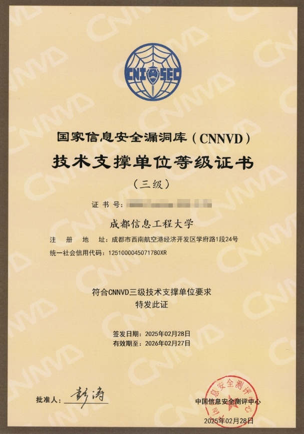 国家信息安全漏洞库(CNNVD)由中国信息安全测评中心运营,是我国权威的漏洞数据管理平台,负责漏洞搜集、分析、通报及消控。学校在漏洞研究与风险防控方面达到国家级标准,成为国家网络安全体系的重要组成部分。近年来,学校在漏洞挖掘、风险研判、安全防护等领域成果显著,尤其在高、中危漏洞的原创性发现和高效响应上获高度评价,在工业互联网安全、关键信息基础设施保护等前沿领域的创新研究,展现了其技术优势和前瞻性布局。此次入选是学校服务“网络强国”战略的新起点。学校将进一步深化网络安全学科建设和人才培养,推动教学与实战融合,打造“学术+实战”双师型教师队伍,为国家培养高素质网络安全人才。