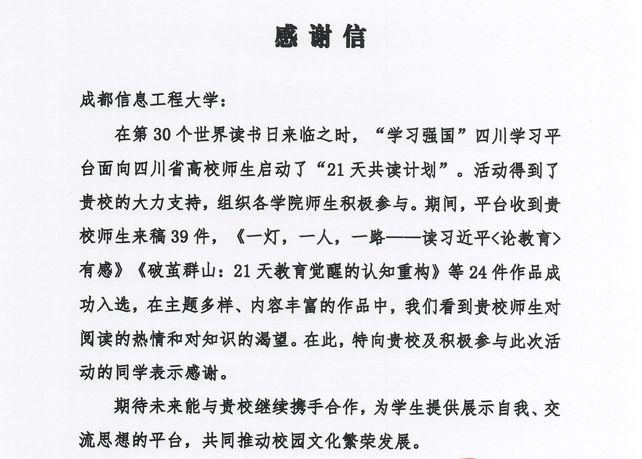 【本网讯】近日,“学习强国”四川学习平台向乐动发来感谢信,对乐动组织学生积极参与“21天共读计划”表示感谢,对乐动积极参与此次活动的学生予以高度赞扬。
