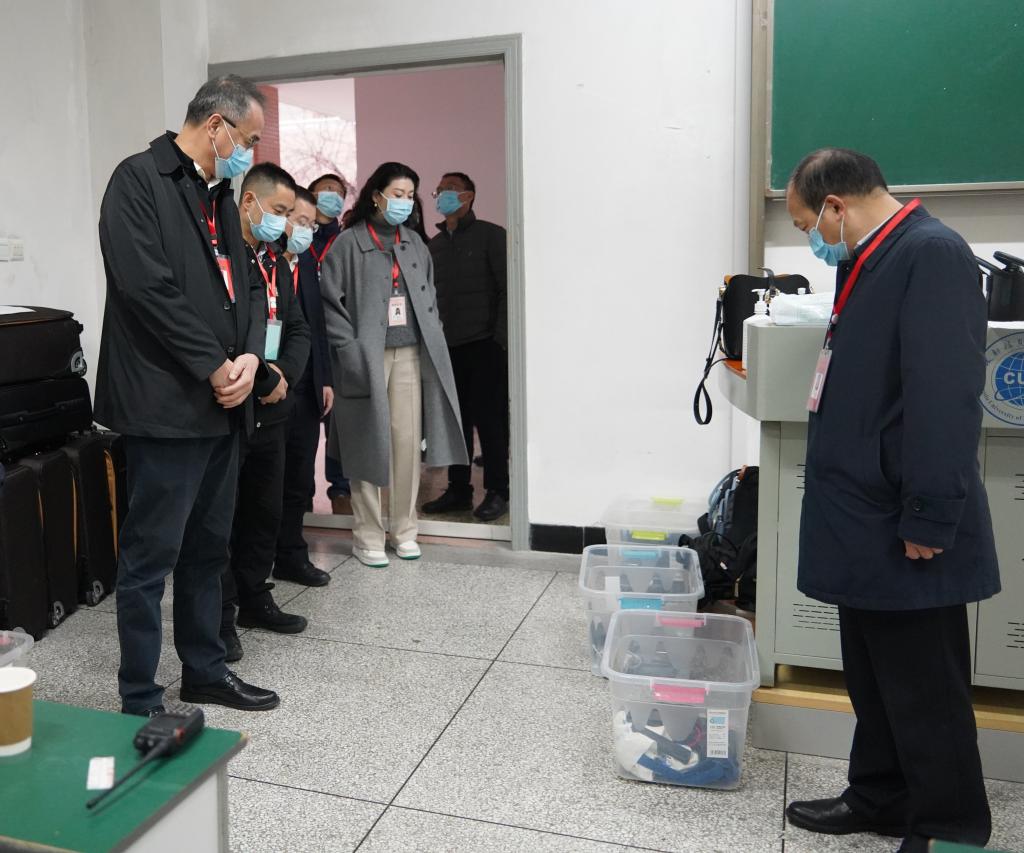 考试期间,学校校长余敏明、副校长何建新带领党政办公室(保密办)、党委宣传部、学生工作处、保卫处、教务处、研究生处、信息中心、后勤基建处等职能部门负责人来到考试现场,查看了视频监控录像、对考场进行巡视。余敏明看望慰问了考点工作人员,并叮嘱相关部门,要通力合作,全力筑牢疫情防控和考试安全“两道防线”,积极营造公平、公正、规范、有序的考试环境;要“以人为本”,为师生服好务,确保考试期间的餐饮保障和食品安全监管。