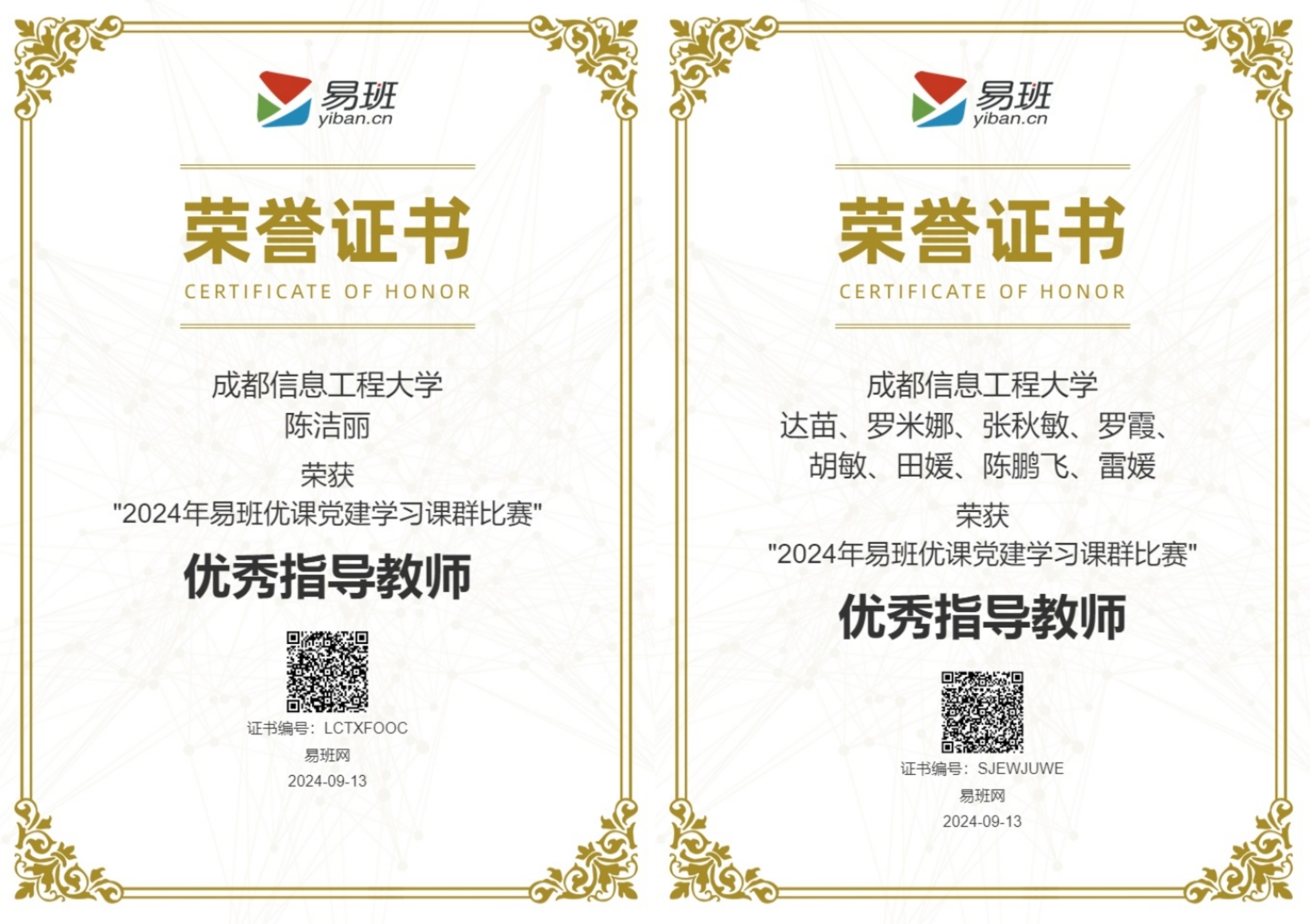 乐动易班指导教师陈洁丽、达苗、罗米娜、张秋敏、罗霞、胡敏、田媛、陈鹏飞、雷媛荣获“2024年易班优课党建学习课群比赛”优秀指导教师荣誉。