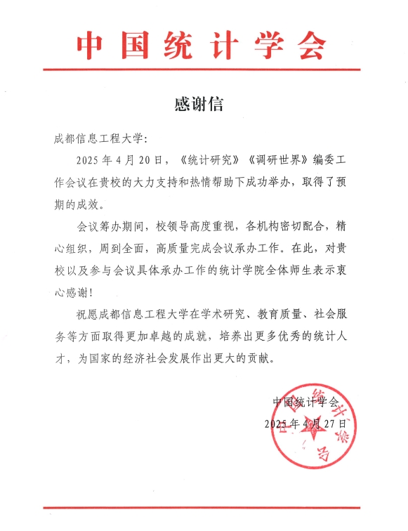 【本网讯】近日,国家统计局主管的中国统计学会向乐动发来感谢信,对乐动筹办2025年《统计研究》《调研世界》编委工作会议所提供的大力支持与热情帮助表示衷心感谢。此次会议于4月20日在成都成功举办,取得了圆满成效,获得了与会各方的高度评价。