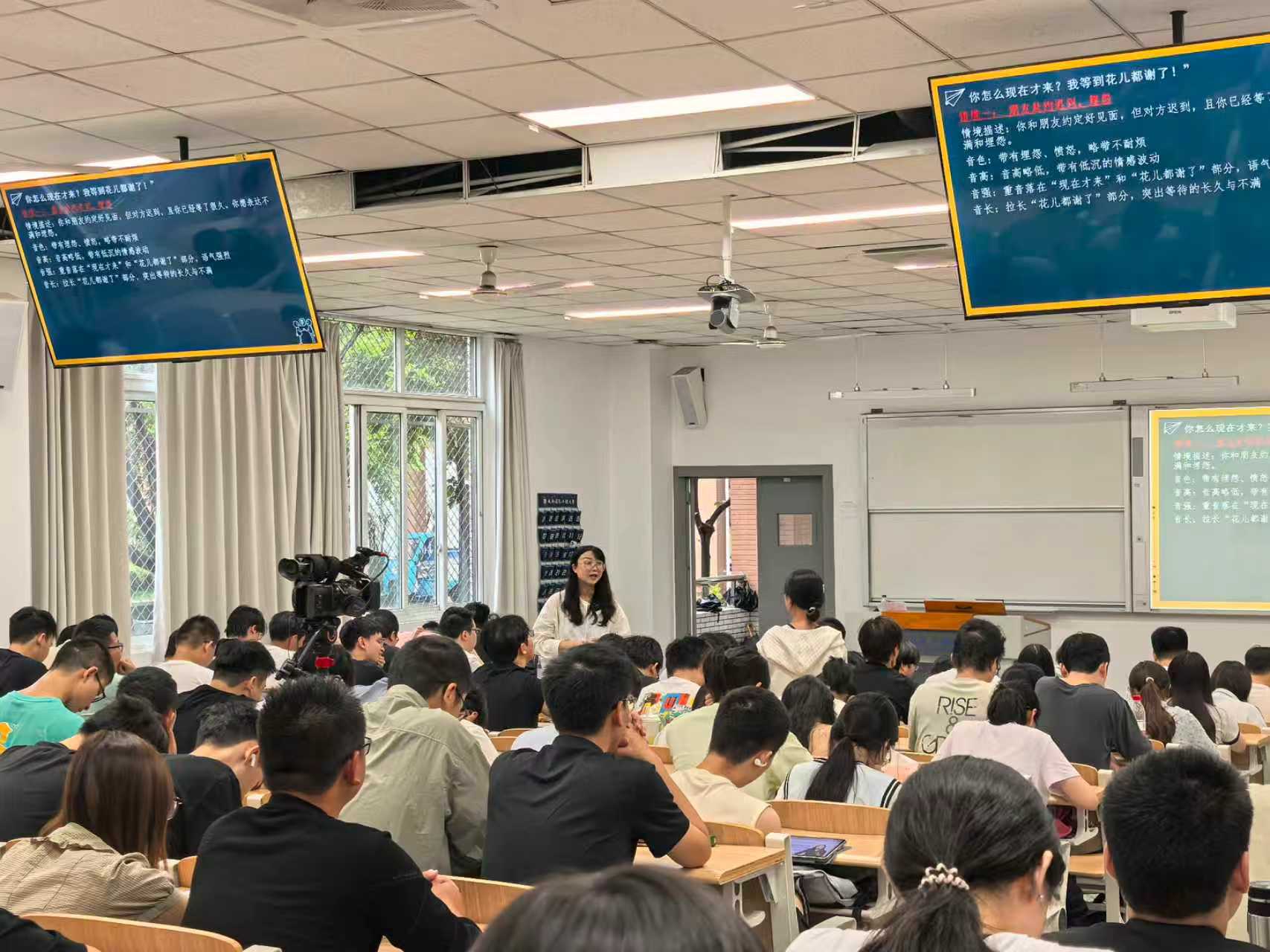 讲座以“我说你画”趣味游戏开场,黄老师随机邀请同学参与互动,通过语言描述与绘画创作的碰撞,瞬间点燃现场氛围。随后,她以“声音、环境、策略”三大维度为框架,系统解析语言交际的核心要素:在声音属性环节,黄老师巧妙对比学生朗诵与康辉在《新闻联播》中朗诵艾青《我爱这土地》的片段,生动展现音色、语调对情感传递的影响,并指导同学们通过“气息控制”“情感投射”等技巧优化表达;环境分析部分,她结合教室、食堂、宿舍等校园场景,揭示空间特征对沟通效果的隐性作用;策略教学环节则通过即兴情景剧演绎,引导同学们代入“宿舍矛盾调解”“社团合作协商”等真实场景,现场诊断交际痛点。