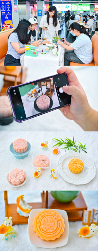 活动现场还布置了充满节日氛围的拍照布景,同学们将作品放在小巧精致的瓷盘里拍照分享,准备将这份承载心意的手作礼物与老师、亲友分享。航空港校区电子工程学院的张同学兴奋地说:“我选择的模具是校徽和玉兔,做出来的月饼既有学校特色又应景!”龙泉校区管理学院的刘同学则现场品尝了香甜的月饼:“第一次吃自己做的月饼,感觉格外好吃!”活动在浓郁饼香与融融笑语中温暖落幕,这份甜蜜的体验也成为秋日校园中一段值得珍藏的记忆。