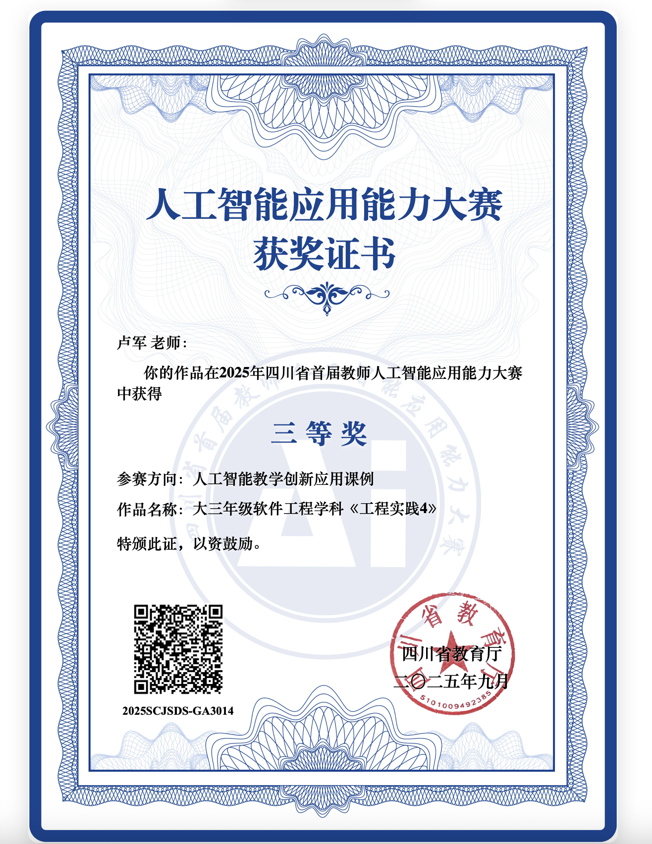 【本网讯】近日,由四川省教育厅主办的首届教师人工智能应用能力大赛获奖名单正式公布,乐动人工智能学院刘强荣获省级二等奖,软件工程学院卢军荣获省级三等奖。