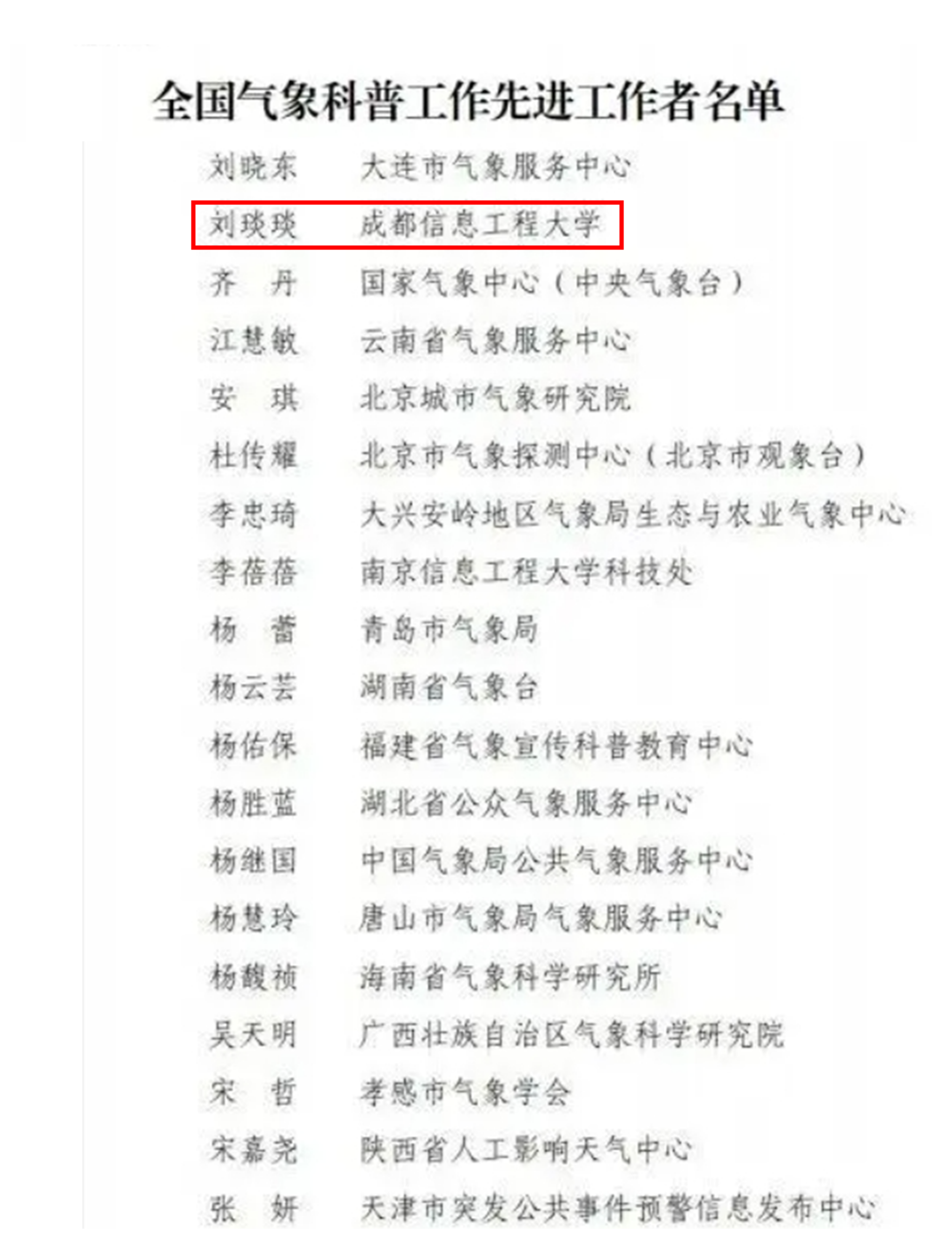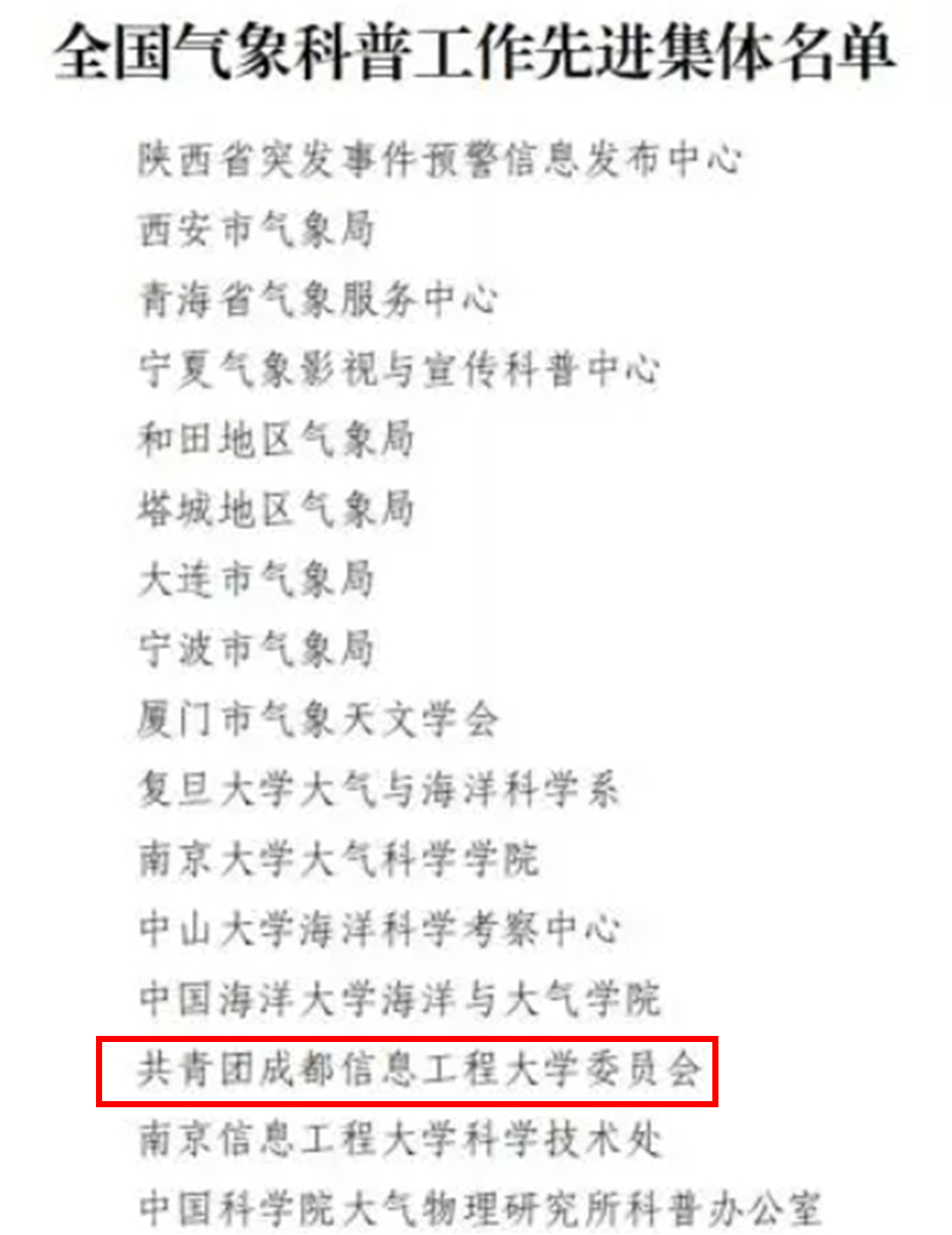 【本网讯】5月10日,中国气象学会对表现突出的各省(区、市)气象学会、各学科(工作)委员会和优秀学会工作者、科普工作先进集体以及先进工作者予以表彰。学校团委被授予“全国气象科普工作先进集体”称号,刘琰琰老师被授予“全国气象科普工作先进工作者”称号,凸显了乐动在气象科普宣传领域的重要影响力。