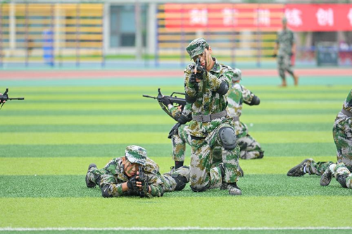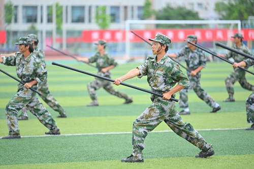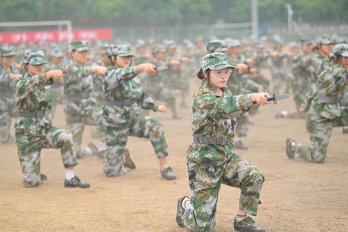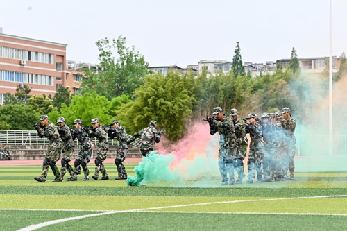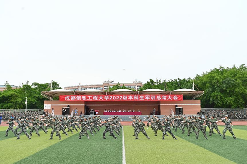 汇报表演伴随着《分列式进行曲》拉开帷幕。标兵就位,迈着矫健的步伐引领着方队依次通过主席台接受领导的检阅。他们队列整齐、口号响亮、朝气蓬勃、斗志昂扬,充分展现了乐动2022级学生奋发向上的精神风貌和军训工作的丰硕成果。同学们沉着、自信的精神面貌赢得了现场师生的阵阵掌声;分列式方队井然有序、整齐划一的步伐,热烈的青春肆意挥洒在洪亮的口号声里;匕首操方队的迅猛刺激、身姿挺拔,彰显着军营之花的英姿飒爽和青春魅力;特种战术方队在爆破声响中迅捷行动,在硝烟弥漫中昂首向前,他们从容不迫,展现铮铮军魂,他们脚步变换,尽显飒爽英姿;刚劲有力的擒敌拳,是学子们热情勇毅与追求卓越的印证;铿锵有力的应急棍,表现了学子们不畏困苦的英勇气魄;同学们用花式队列摆出“CUIT”、“中国地图”等图样的队形,表达了成信学子对党和祖国的热爱以及对学校的祝福,同学们步伐整齐、热情饱满、斗志昂扬,展现了成信学子锐意进取、追求卓越的精神风貌。