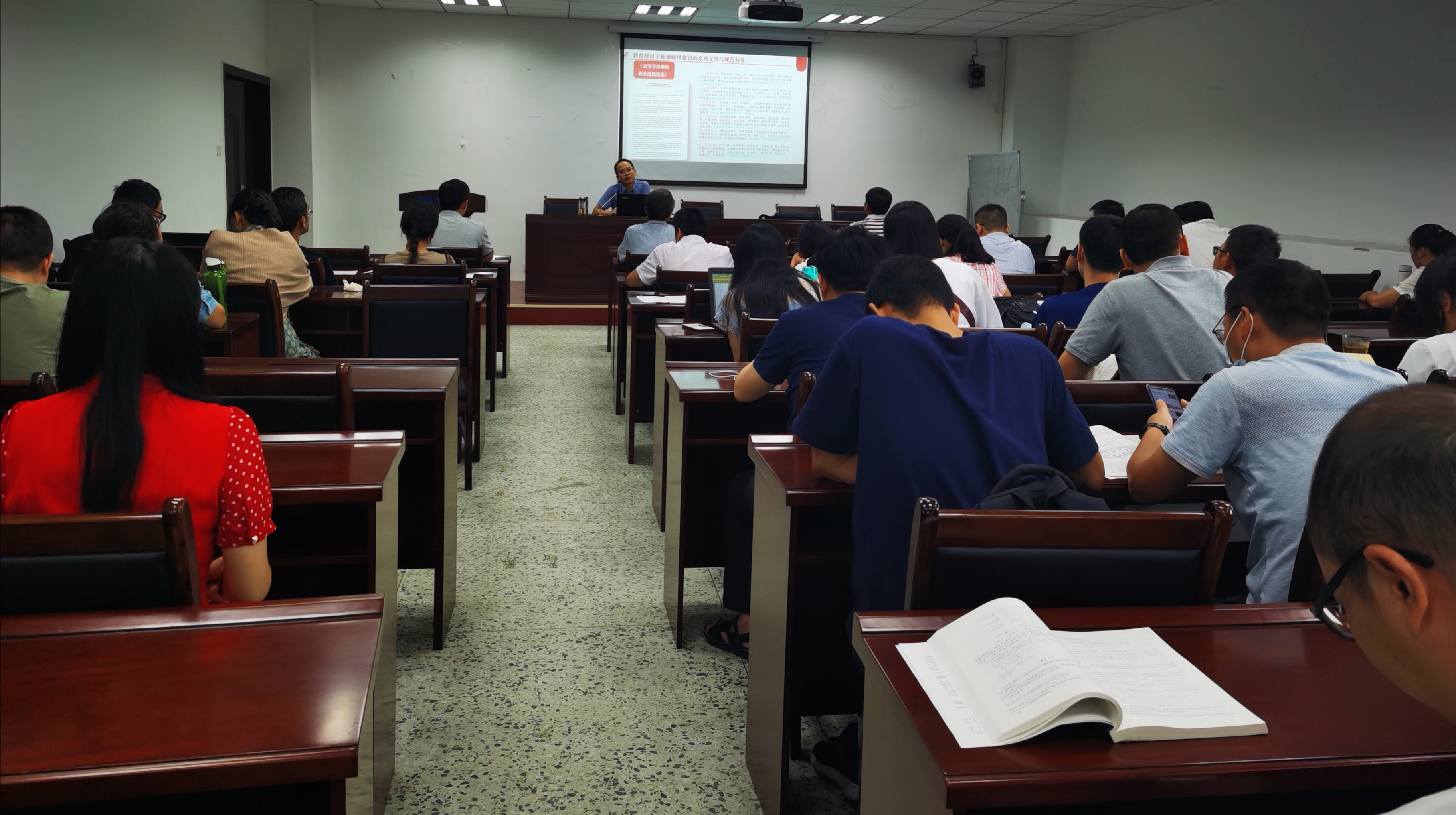 马义华从“教育部对于师德师风建设的系列文件与规范标准”“加强师德失范的处理”“学院师德师风建设的思考”三个方面进行了阐述。他结合常见的问题以及身边的人和事,重点解读了《高校教师职业道德规范》《严禁教师违规收受学生及家长礼品礼金等行为的规定》《教育部关于建立健全高校师德建设长效机制的意见》和《新时代高校教师职业行为十项准则》等系列文件,为全院教职工亮明红线底线,警示大家。围绕《教育部关于高校教师师德失范行为处理的指导意见》等相关文件,马义华就师德建设中学校、院(系)和教师个人的责任、处理规范等进行了详细讲解,帮助大家进一步明确责任和后果。他提到,软件工程学院要始终坚定正确政治办学方向,不断探索建立和完善考核评价制度,进一步加大典型选树力度,切实维护师生利益,积极营造遵规守纪、团结向上、和谐温暖的学院工作学习生活氛围。希望全体老师对标“四有”好老师标准,严格要求自我,努力提升自身综合能力和素养,为学校和学院建设发展贡献力量。