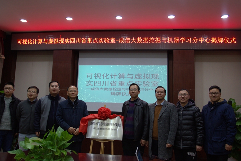 【本网讯】12月2日,“可视化计算与虚拟现实四川省重点实验室—成信大数据挖掘与机器学习分中心”揭牌仪式在第六会议室举行。可视化计算与虚拟现实四川省重点实验室学术委员会主任张健教授、陈光淦教授、副主任刘浏教授,学校科技处副处长程志刚、应用数学学院院长周钰谦、应用数学学院党委书记李明、副院长吴泽忠等参加了揭牌仪式。揭牌仪式由应用数学学院实验室主任李胜坤主持。