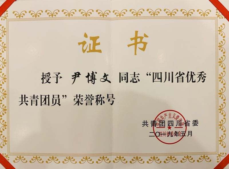 【本网讯】为表彰先进,树立榜样,激励更多团员青年在决胜全面小康、建设经济强省、推动治蜀兴川中发挥生力军和突击队作用,近日,根据共青团四川省委《关于表彰2019年四川省优秀共青团员、优秀共青团干部、五四红旗团委(团支部)的决定》,乐动通信工程学院通信工程专业2016级5班尹博文同学荣获“四川省优秀共青团员”称号。