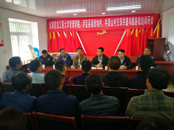 【本网讯】为扎实推进脱贫攻坚工作,9月26日,管理学院教工党支部与泸定县蒲麦地村、牛背山村党支部开展结对共建活动,开展旅游规划调研。管理学院党总支副书记李璘来,教工党支部书记、旅游管理专业主任何源,党组织委员刘巧,党小组长王旌璇,乐动赴蒲麦地村驻村干部樊昌元、牛背山村驻村干部朱正华,两村驻村第一书记及其它驻村干部、党支部书记、村民委员会主任及部分党员同志共30余人参加了座谈会。泸定县文化旅游和广播影视局发展规划处主任黄永邦到会指导,会议由何源主持。