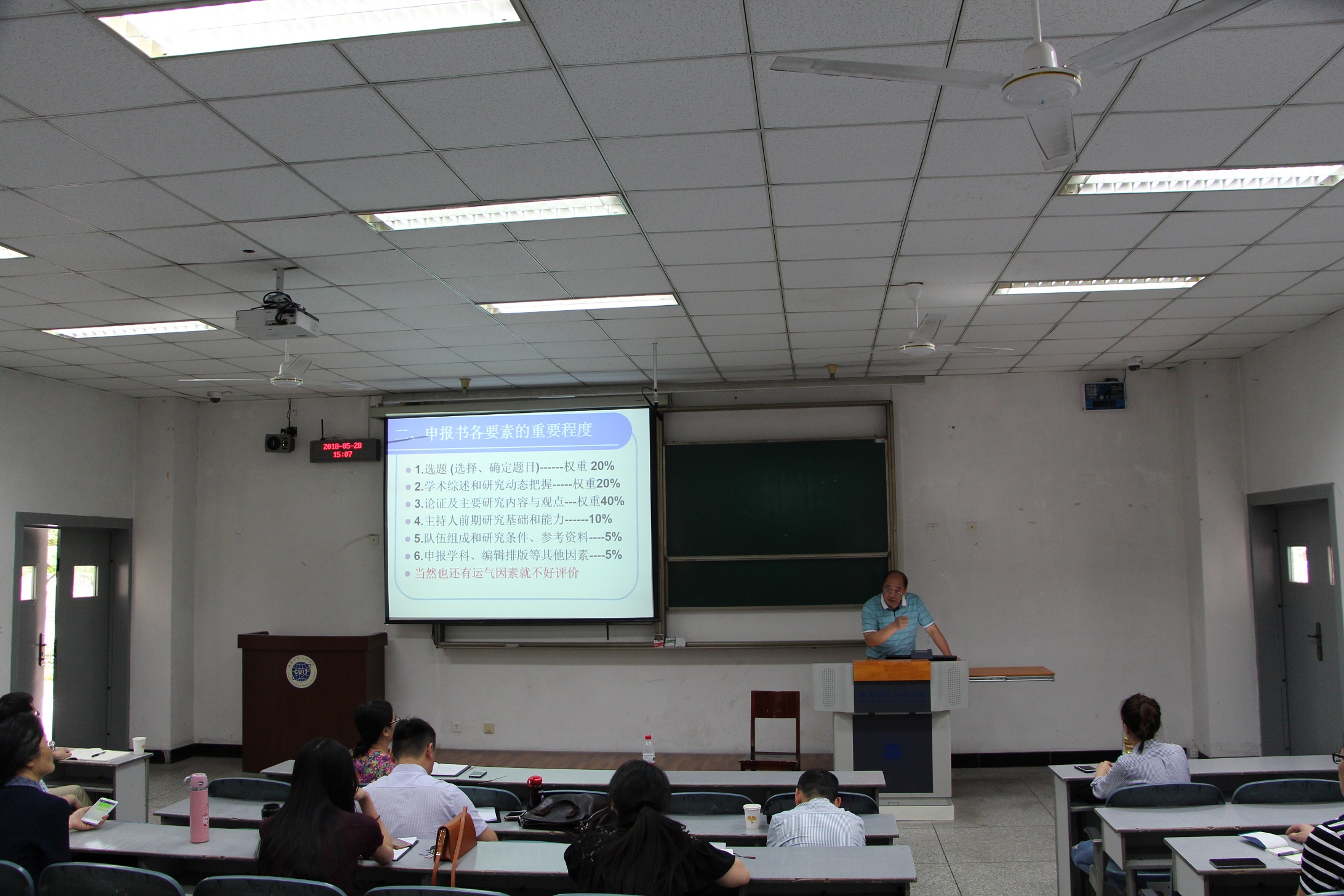 罗建文从人才队伍建设、学科建设及其与马克思主义学院建设之间的重要性进行了深入分析和探讨,对乐动马克思主义学院的建设起到了重要指引作用。他主要围绕国家社科基金项目申报书的组成要素及其权重比例、申报书的填写以及科研项目的培育准备等方面做了深入而全面的阐述。他结合自己申报各类项目的经历,和近年来担任国家社科基金项目通信评审专家的经验,就申报书的各个要素和各个部分内容要求,以及注意事项等方面做了详细的讲解和分析,受到了与会老师的好评。在场的广大教师纷纷表示获益颇丰,对自己日后的科研工作,有积极地引领作用。
