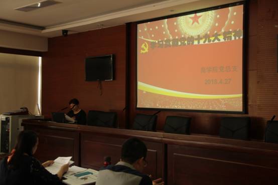 【本网讯】4月27日下午,商学院党总支在龙泉1213会议室组织教师党员学习十九大专题会议。本次会议由院长曹邦英主持,学工办主任刘春玉主讲。