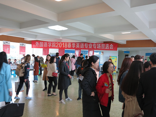 【本网讯】3月19日上午,为促进英语专业毕业生充分就业,进一步提高2018届英语专业毕业生的就业质量,更好地加强校企合作,外国语学院在航空港校区信息楼三楼成功举办“外国语学院2018春季英语专场双选会”。