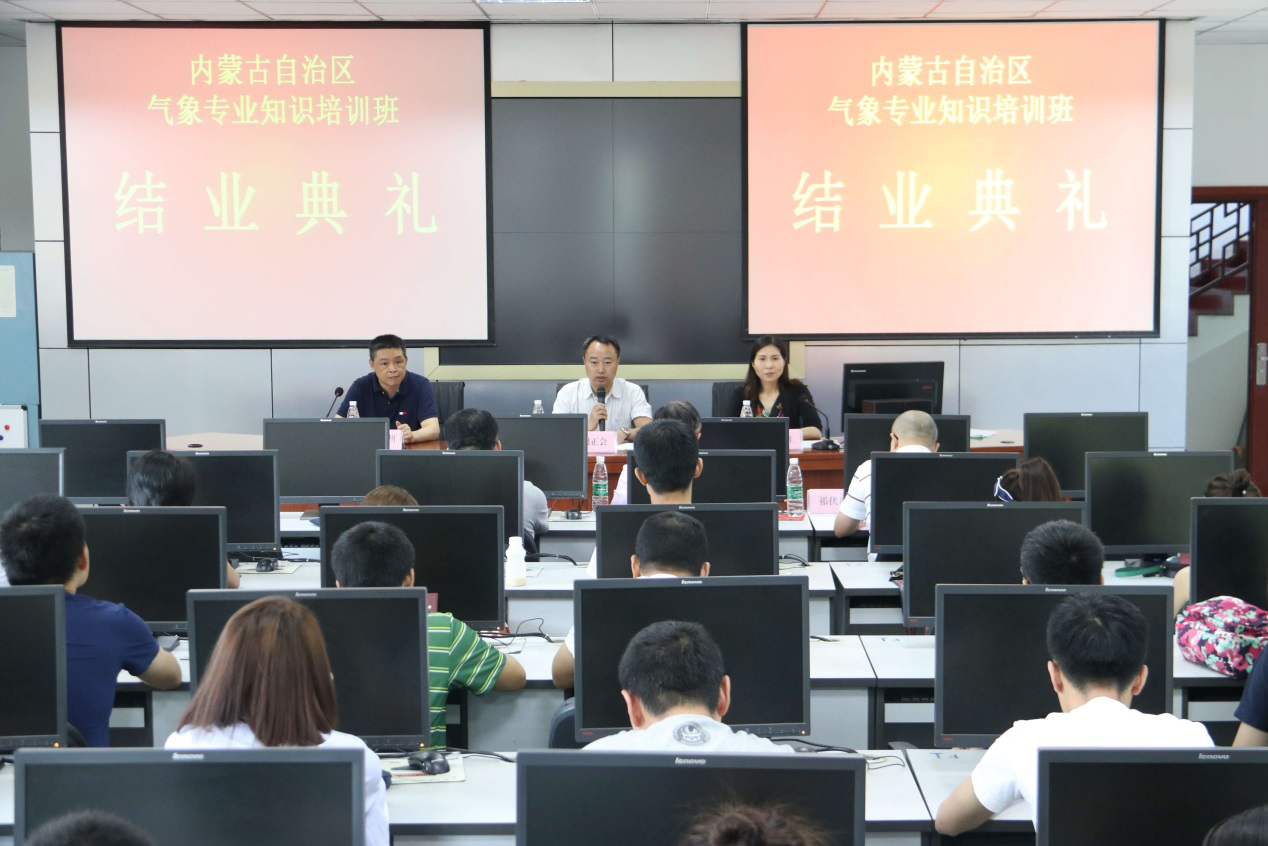 内蒙古自治区气象专业知识培训班顺利结业,结业典礼于6月7日上午在航空港校区气象楼101教室举行,大气科学学院院长范广洲、党总支书记张小红、内蒙古自治区气象局人事处副处长刘正会、中国气象局首席预报员正研级高工韩经纬、内蒙区局气象台副研级高工祁伏裕、内蒙区局人事科长段心灵、培训班管理人员和全体参训学员参加了结业典礼。结业典礼由张小红主持。