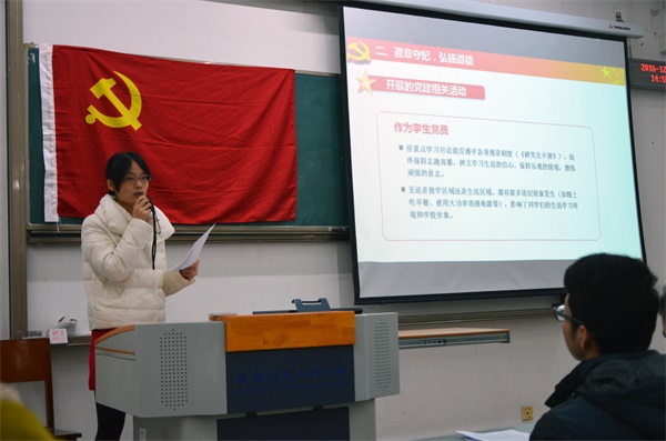 【本网讯】为深入贯彻学校党委和学院总支“两学一做”第三专题学习讨论的要求,学习党的十八届六中全会和省委十届九次全会精神,进一步扎实开展“两学一做”学习教育。12月13日下午,大气科学学院研究生第一党支部召开了以“遵章守纪,弘扬道德”为主题的学习讨论会。会议由党支部委员张晗主持,研究生班主任胡培老师参加了会议。