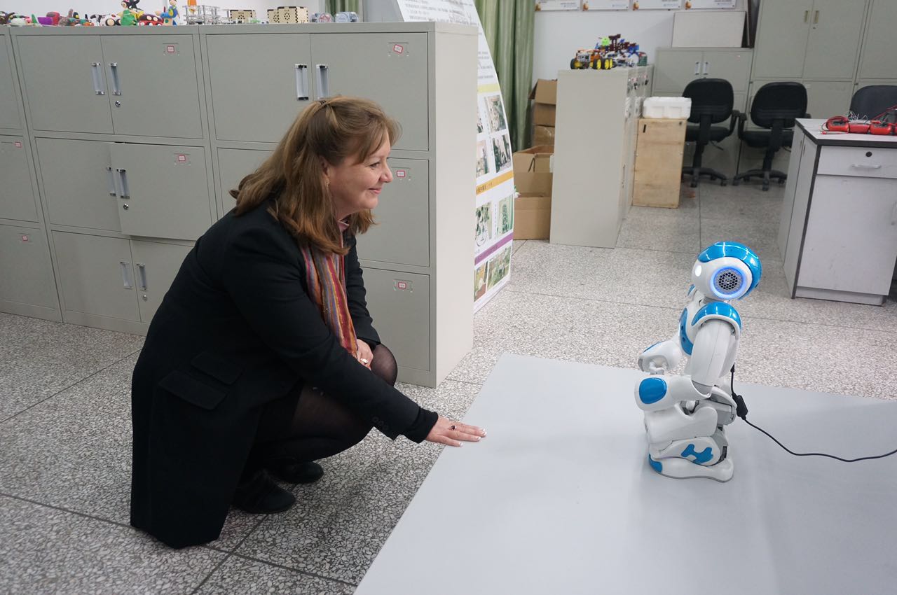 乐动学生自主设计的机器人对Dr. Claire McGowan进行人脸识别